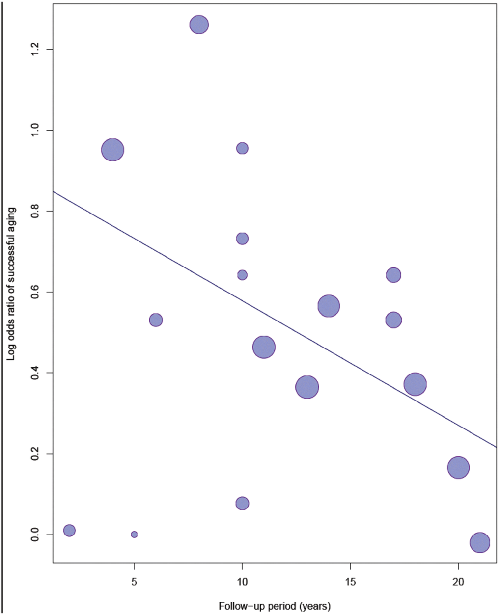 Figure 4 shows the bubble plot with fitted meta-regression line of the log OR of successful aging and follow-up years. In the univariate regression model, the regression line showed a significantly decreased trend of successful aging over time (OR= 0.97, 95% CI = 0.94–0.99, p = 0.045). The effect of physical activity on successful aging reduced annually by approximately 3%.