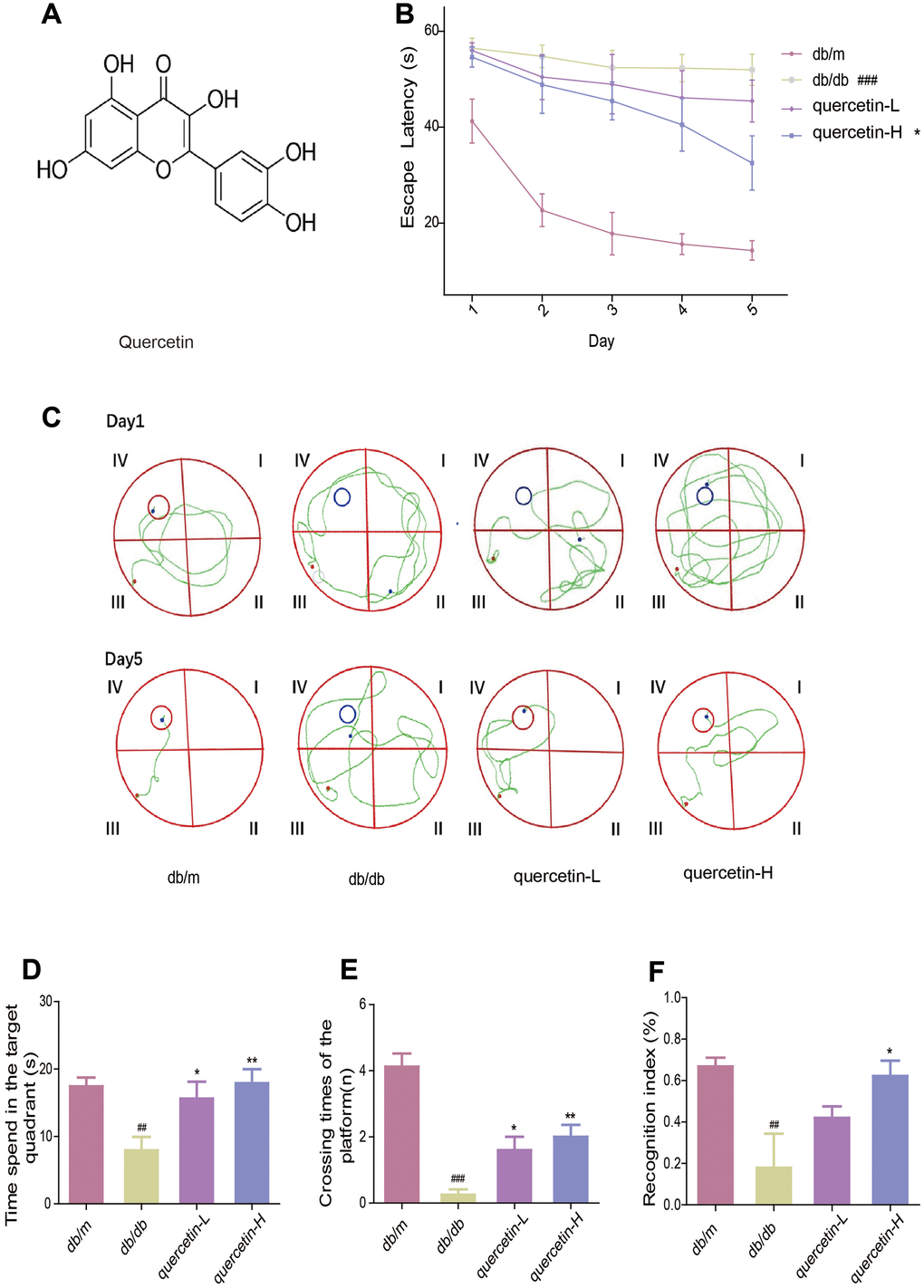 To measure the memory and learning abilities of db/db mice, we performed Morris water maze and new object recognition test. In the Morris water maze test, the time it takes for the mouse to find the central platform is decreasing (Figure 1B). Compared with the db/m group, the db/db group significantly increased the time to find the platform. After treatment with quercetin, the time to find the platform was significantly shorter, especially in the high dose group (Figure 1B). After five days’s training, the swimming path of db/db was more disordered than db/m, while the quercetin-treatment group was significantly improved (Figure 1C). In addition, after the platform was removed, the numbers of exploration of the db/db group in the platform area and the time spend in the target quadrant were significantly reduced. Quercetin-treatment group reversed the phenomena (Figure 1C, 1D).