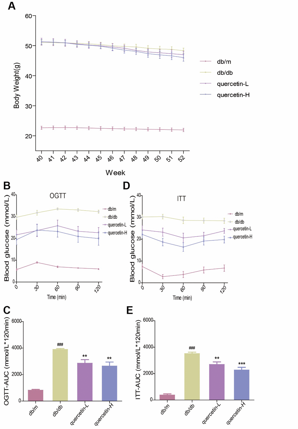 In the OGTT test, the blood glucose level and the area under the curve at each test time point of the db/db mice were significantly higher than those in the db/m group. However, after 12 weeks of quercetin treatment, the blood glucose level was significantly lower, especially in the high-dose group (Figure 2B, 2C). In the ITT test, insulin sensitivity in db/db mice was significantly lower than in the db/m group (Figure 2D, 2E). After 12 weeks of quercetin treatment, insulin sensitivity and area under the corresponding curve were relatively improved. These results demonstrated that quercetin could reduce fasting blood glucose and improves glucose tolerance and insulin resistance.