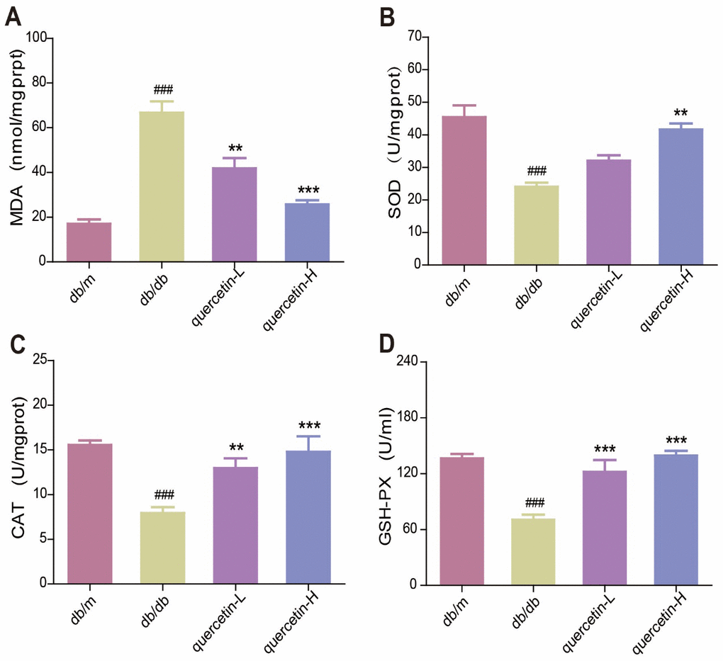 In the brain of db/db mice, the level of endogenous lipid peroxide MDA increased, and the activity of SOD, CAT and GSH-PX were significantly reduced (Figure 3A–3D). Quercetin significantly relieved the oxidative stress when compared with the db/db group. These results showed that quercetin could remarkably decrease the level of oxidative stress in db/db mice.
