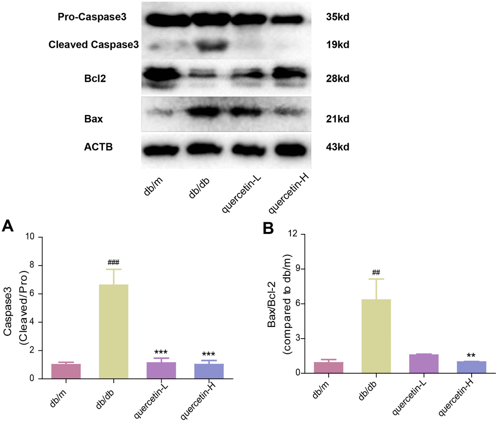 The 10-week-old female diabetic mice (db/db) and age-matched non-diabetic mice (db/m) were from the Model Animal Research Institute of Nanjing University (Nanjing, China). The mice were in SPF animal room, where is a 12-h light/dark cycle at a relative humidity of 40-60 % and temperature 20-25 °C. Then, animals were allowed free access to food and water. After 30 weeks, fasting blood glucose > 11.1 mmol/L was defined as the success criterion for diabetic model. The mice were randomly divided into four groups: db/m (0.9 % saline, n = 10), db/db (0.9 % saline, n = 10), low dosage of quercetin (35 mg/kg/day, n = 10) high dosage of quercetin (70 mg/kg/day, n = 10). Drugs were administered for 12 weeks by gavage. In addition, our experiments are in strict compliance with the guidelines promulgated and adopted by the NIH.