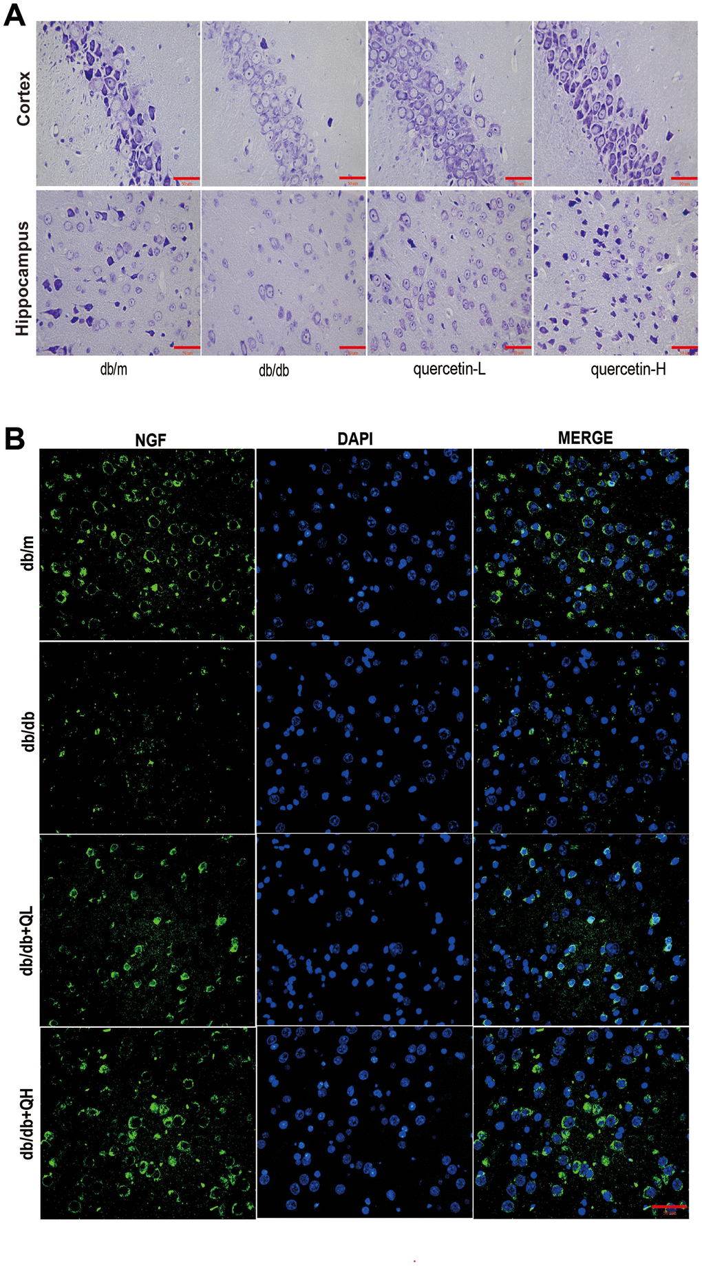 In the brain tissue of db/db mice, the expression of proapoptotic protein Bax and cleaved Caspase3 protein increased significantly, and the expression of apoptosis-inhibiting protein Bcl-2 was relatively decreased (Figure 4). After 12 weeks of quercetin treatment, Bcl-2 expression was increased, and the expressions of Bax and cleaved Caspase-3 were sharply reduced. In addition, the expression of neurotrophic factors (BDNF, NGF) and synaptic proteins (PSD93, PSD95) was significantly reduced in db/db mice (Figures 5 and 6B). Quercetin significantly improved the expression of neurotrophic factors and synapse-related proteins. Nissl staining was further verified this change (Figure 6A). In the hippocampal and cortical areas of db/db mice, Nissl body was largely lost and stained weakly. Notably, after quercetin administration, these neurons were found a deeper and denser Nissl body. These results indicated that quercetin could protect against neurodegeneration in db/db mice.