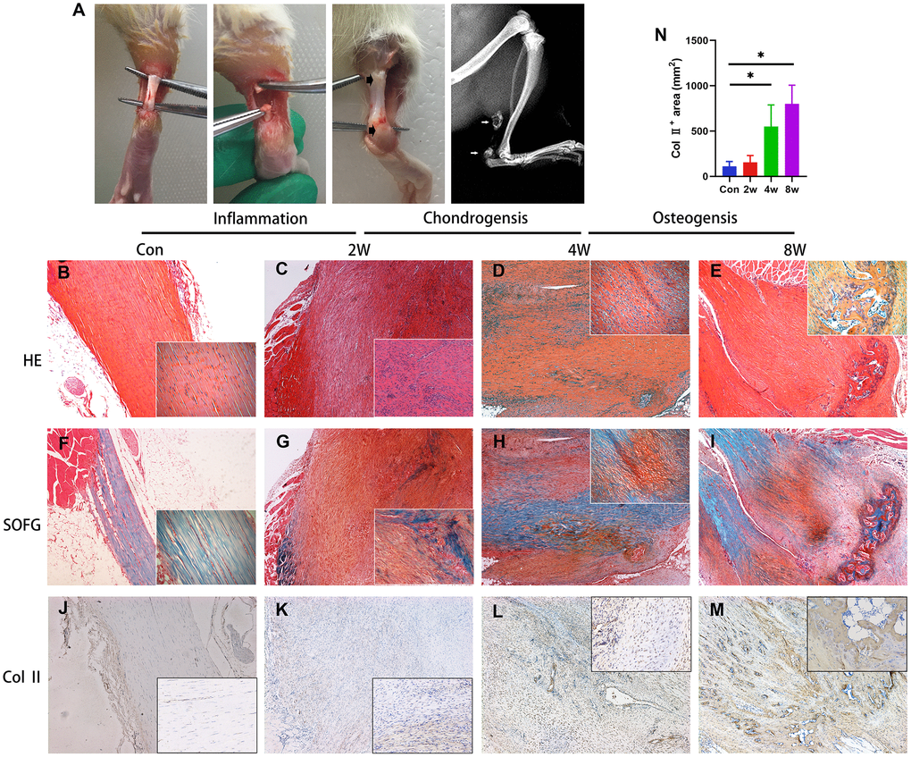 To confirm the pathogenesis of HO, the rats were anesthetized 8 weeks post-surgery and subjected to radiological analysis. The X-ray images demonstrated the formation of bone-like tissues near the areas of the tendon-to-bone junction and tendon-to-muscle junction (Figure 1A). H&E (Figure 1B–1E) and Safranin O and fast green (SOFG) (Figure 1F–1I) staining also confirmed the process of endochondral ossification occurred in injured Achilles tendon, as well as shown in immunohistology staining of Col 2 (Figure 1J–1N).