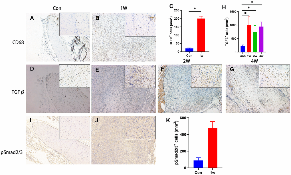 Previous studies have demonstrated the elevated TGF-β released by macrophages at the inflammation stage triggers HO [4]. Here, we found the TGF-β signal not only participated in the inflammation stage but also triggers chondrogenic differentiation during HO development. We found that accumulation of CD68+ immune cells (macrophage) and high levels of active TGF-β 1 week after injury in rat Achilles tendon HO model (Figure 2A–2E, 2H), suggesting that active TGF-β and immune cells are closely related to the onset of HO. Moreover, the elevated level of TGF-β1 was also found at 2- and 4-weeks post-surgery (Figure 2F–2H), as known as the chondrogenic differentiation period. The number of phosphorylated Smad2/3-positive (pSmad2/3+) cells, the major TGF-β downstream signaling transducer, was also found significantly elevated (Figure 2I–2K). Altogether, our results reveal that the acquired HO model in rat Achilles tendon developed via endochondral ossification, with high levels of active TGF-β in the microenvironment during inflammation and chondrogenic stages.
