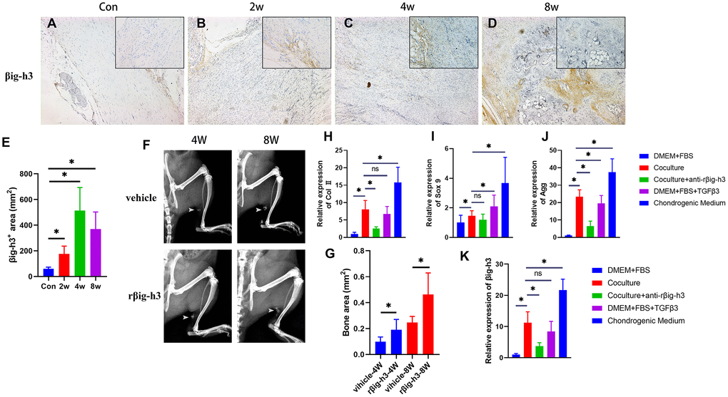 To explore the effect of βig-h3 in chondrogenic differentiation in vitro, we first cocultured the iTDSCs with macrophage cells. After 3 days’ coculture, the iTDSCs were collected for RT-PCR analysis of chondrogenesis genes. The co-cultured iTDSCs demonstrated markedly more Sox 9, Aggrecan, and Col II expression than the cells without (Figure 3H–3J), similar to the cells cultured with additional TGFβ3, though much lower than the cells cultured in complete chondrogenic differentiation medium (Figure 3H–3J). Moreover, in presence with the antibody-neutralized rβig-h3, the expression of chondrogenic markers decreased significantly (Figure 3H–3J). Similarly, upon coculture, exogenous TGFβ3, or chondrogenic medium, the expression of βig-h3 is obviously elevated and can be inhibited by the additional anti-rβig-h3 (Figure 3K).