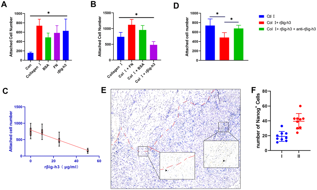 To assess the effects of βig-h3 on iTDSCs’ adhesion to the injury site (mainly to tenocytes and type I collagen), iTDSCs were plated on 96-well plates coated with collagen I, BSA, FN, rβig-h3, or nothing. Significant more iTDSCs were attached to the rβig-h3 coated plates, in comparison with plates coated with nothing. However, no such differences were found in comparison with plates coated with collagen I, BSA, or FN (Figure 4A). The cells were also plated on collagen I coated 96-well plates supplied with BSA, FN, rβig-h3, or rβig-h3 + anti-βig-h3 antibody. rβig-h3 significantly inhibited the attachment of iTDSCs to collagen I, in comparison with BSA and FN (Figure 4B). The inhibition effect of rβig-h3 was also in a dose-dependent manner (Figure 4C), but can be interrupted by the additional antibody-neutralized rβig-h3 (25 μg/ml rβig-h3 + 50 μg/ml anti-βig-h3) (Figure 4D). Additionally, to figure out whether the reduction of attachment of iTDSCs to collagen I may inhibit the iTDSCs homing to the injured tendon sites, we further utilized the Nanog antibody as a iTDSCs marker to locate the cells. The recruited Nanog+ cells were mainly located far away from the tendon tissue but not around the injured tendon (Figure 4E, 4F). In summary, the cell attachment test demonstrated βig-h3 functioned as an adhesion substratum for iTDSCs in vitro but inhibited the adhesion of iTDSCs to collagen I, which means the recruited iTDSCs couldn’t bind to the injured tendon successfully. It may be the reason why in the tendon injury model, the recruited TDSCs formed cartilage but not the regeneration of tendon tissues.