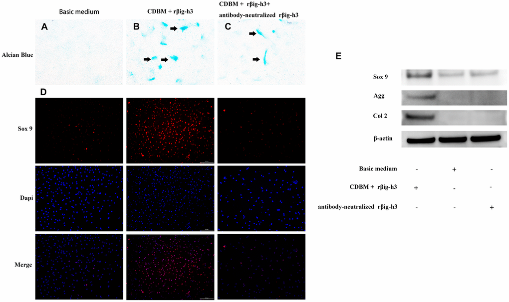 To gain further insights into the potential role of βig-h3 in mesenchymal condensation and chondrogenic differentiation, we performed micromass and monolayer cultures with iTDSCs in chondrogenic differentiation medium with or without the supplement of additional rβig-h3. The iTDSCs supplied with rβig-h3 formed condensations identifiable after 7 days of culture (Figure 5A), which is much earlier than the cells without the supply of rβig-h3 (Figure 5B). And the effect could be inhibited by the additional antibody-neutralized rβig-h3 (Figure 5C). Further, to figure out whether βig-h3 was directly associate with cartilage differentiation besides cell aggregation. The monolayer chondrogenic culture with or without additionalβig-h3 was performed. Similar results were found via immunofluorescence staining of Sox 9 (Figure 5D) and western blots (Figure 5E). Thus, taken together, βig-h3 might induce chondrogenic differentiation of iTDSCs via promoting condensations and chondrogenic differentiation.
