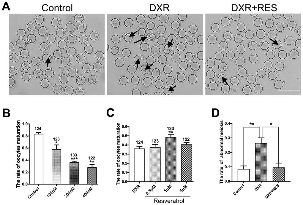 Compromised fertility is one of the side effects of chemotherapy. Therefore, it is imperative to explore the molecular mechanisms of DXR treatment on female reproductive performance to take effective prevention methods in the clinic. Recent studies have demonstrated that RES protects oocytes from chemical agents-induced oxidative stress and apoptosis. Thus, we designed this study to investigate the possible protective role of RES on DXR-induced damage in mouse oocytes.
