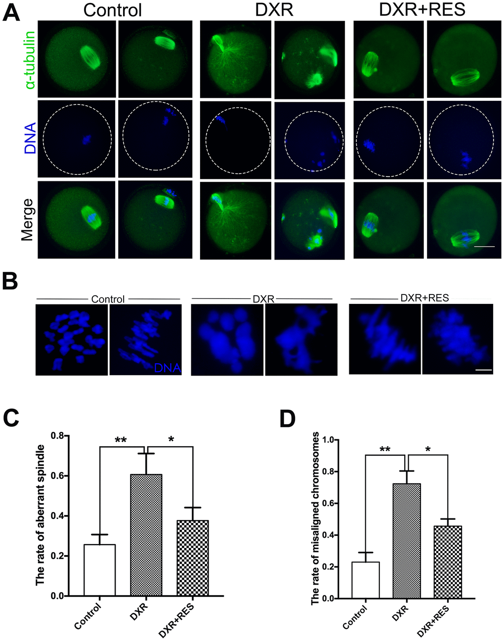 RES restores the disrupted spindle structure and chromosome alignment in DXR-treated oocytes