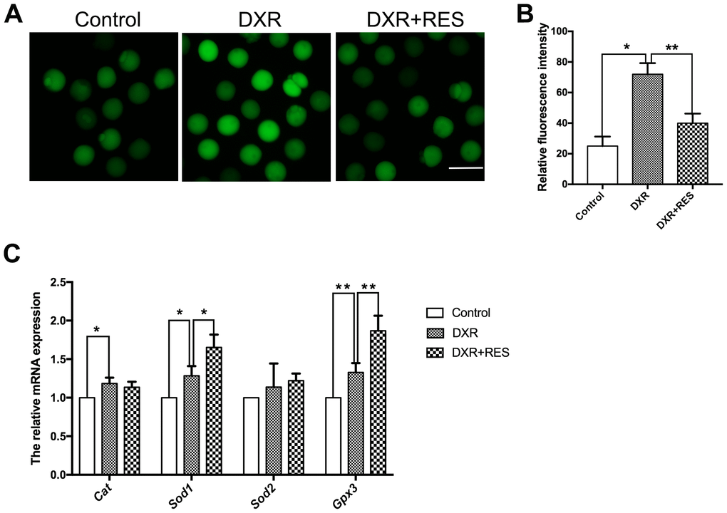 Previous studies in different cell lines have demonstrated that ROS is one of the major toxic effects of DXR. To testify whether this was the case in oocytes as well, we detected the ROS level by DCFH-DA fluorescent probe. As shown in Figure 3A, the green signals were considerably stronger in DXR exposure oocytes. Statistical data showed that the fluorescence intensity of ROS was higher in DXR treated group compared with that in control group, but reduced in RES administration group (25 ± 3.61, n = 105 vs. 72 ± 4.16, n = 93 vs 40 ± 3.61, n = 95, P< 0.01) (Figure 3B). We next assessed mRNA expression of antioxidant genes Cat, Sod1, Sod2 and Gpx3. As shown in Figure 3C, the mRNA levels of Cat, Sod1, and Gpx3 were significantly increased while the mRNA levels of Sod2 had no significant difference between the control and DXR treatment groups. Instead, RES reduced ROS levels and elevated the related antioxidant genes expression (Figure 3A–3C). Thus, these results suggested RES prevented oocytes against DXR-induced oxidative stress.