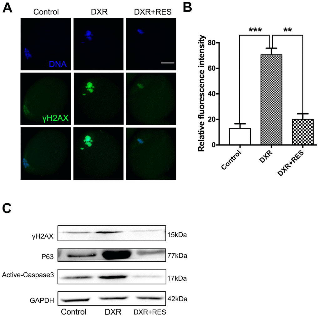 Accumulating evidence has demonstrated that excessive ROS leads to DNA damage. Since DXR treatment caused severe oxidative stress in mouse oocytes, we wonder whether DXR treatment would cause DNA damage to oocytes. H2A histone family member X (H2AX) is one of several genes coding for histone H2A. γ-H2AX is widely used as a marker for DNA DSBs damage. We first examined γ-H2AX expression by immunofluorescence staining. As shown in Figure 4A, 4B, DXR treatment caused severe DNA damage to oocytes, whereas RES reduced DNA damage signal to an indistinguishable level compared with that in control group according to quantitative analysis of fluorescence intensity (70.67 ± 2.96, n = 95 vs. 13.00 ± 2.08, n = 102 vs 20.00 ± 2.52, n = 93, P <0.05). To further explore the possible pathway responsible for DXR-induced DNA damage, we then examined the protein expression of P63. Previous studies in ovarian follicles demonstrated that P63 was involved in cisplatin-induced DNA damage in mouse oocytes [19]. As shown in Figure 4C, P63 expression was markedly increased in DXR treated oocytes. Since DNA damage often triggered apoptotic pathways, we next examined active Caspase3 in both groups. As shown in Figure 4C, compared with control group, active Caspase3 expression was significantly increased in DXR-treated group, which indicated DXR treatment induced cell death in oocytes. As expected, RES rescued DXR-induced apoptosis by DNA-damage-P63-Caspase3 pathway (Figure 4A–4C).