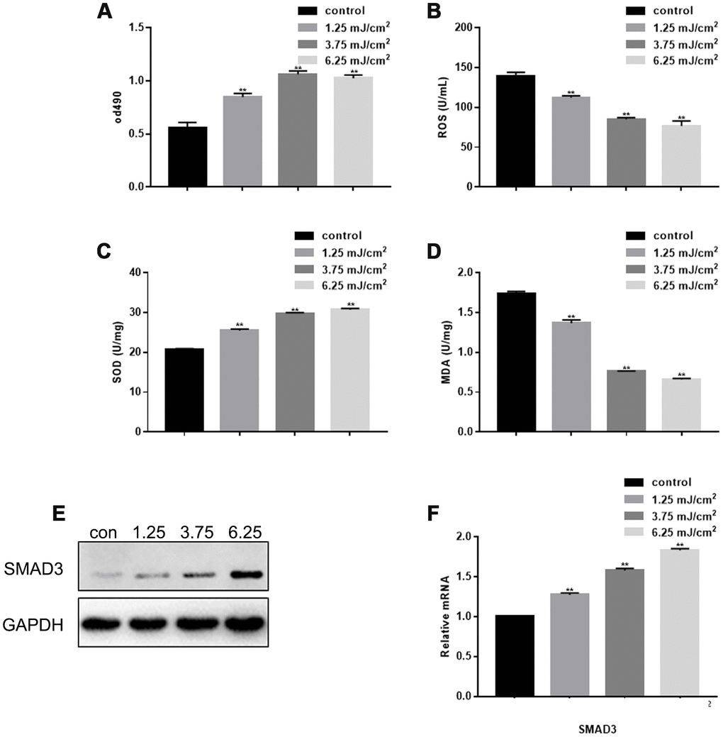 Using different doses of laser irradiation, MTT results showed that CO2 lattice laser could promote fibroblast proliferation, and the proliferation was enhanced with increasing laser dosage (Figure 1A). However, there was no significant difference in the proliferation ability between 3.75 mJ/cm2 irradiation group and 6.25 mJ/cm2 irradiation group. CO2 lattice laser also inhibited cell senescence by down-regulating production of reactive oxygen species (ROS) and malondialdehyde (MDA), and up-regulating expression of superoxide dismutase (SOD) (Figure 1B–1D). In addition, CO2 lattice laser increased gene and protein expression of SMAD3 (Figure 1E, 1F).
