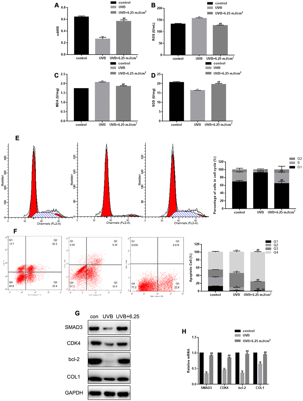 As shown previously, UVB irradiation inhibited fibroblast proliferation, promoted expression of ROS and MDA, and inhibited expression of SOD (Figure 2A–2D). The inhibition of fibroblast proliferation and SOD expression, and the up-regulation of ROS and MDA induced by UVB irradiation were restored by CO2 lattice laser irradiation (Figure 2A–2D). In addition, UVB irradiation induced cell cycle arrest in G1 phase, and increased fibroblast apoptosis. However, the cell cycle arrest and apoptosis were reversed after CO2 lattice laser treatment (Figure 2E, 2F). Furthermore, CO2 lattice laser up-regulated gene and protein expression of SMAD3, CDK4, Bcl-2, and collagen 1 (COL1), which were down-regulated by UVB irradiation (Figure 2G, 2H).