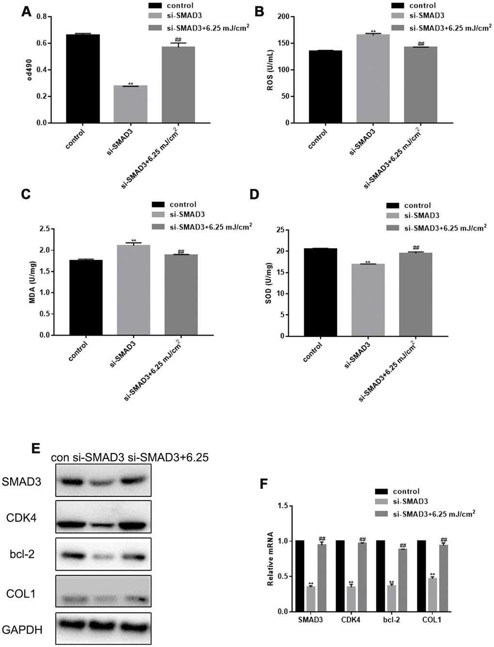SMAD3 silencing inhibited fibroblast proliferation, but the proliferation was restored after CO2 laser irradiation (Figure 3A). SMAD3 silencing also increased the levels of ROS, up-regulated the expression of MDA, and down-regulated the expression of SOD; however, this effect was alleviated by CO2 lattice laser irradiation (Figure 3B–3D). In addition, CO2 lattice laser increased the expression of CDK4, Bcl-2, and COL1 induced by silencing SMAD3 (Figure 3E, 3F).