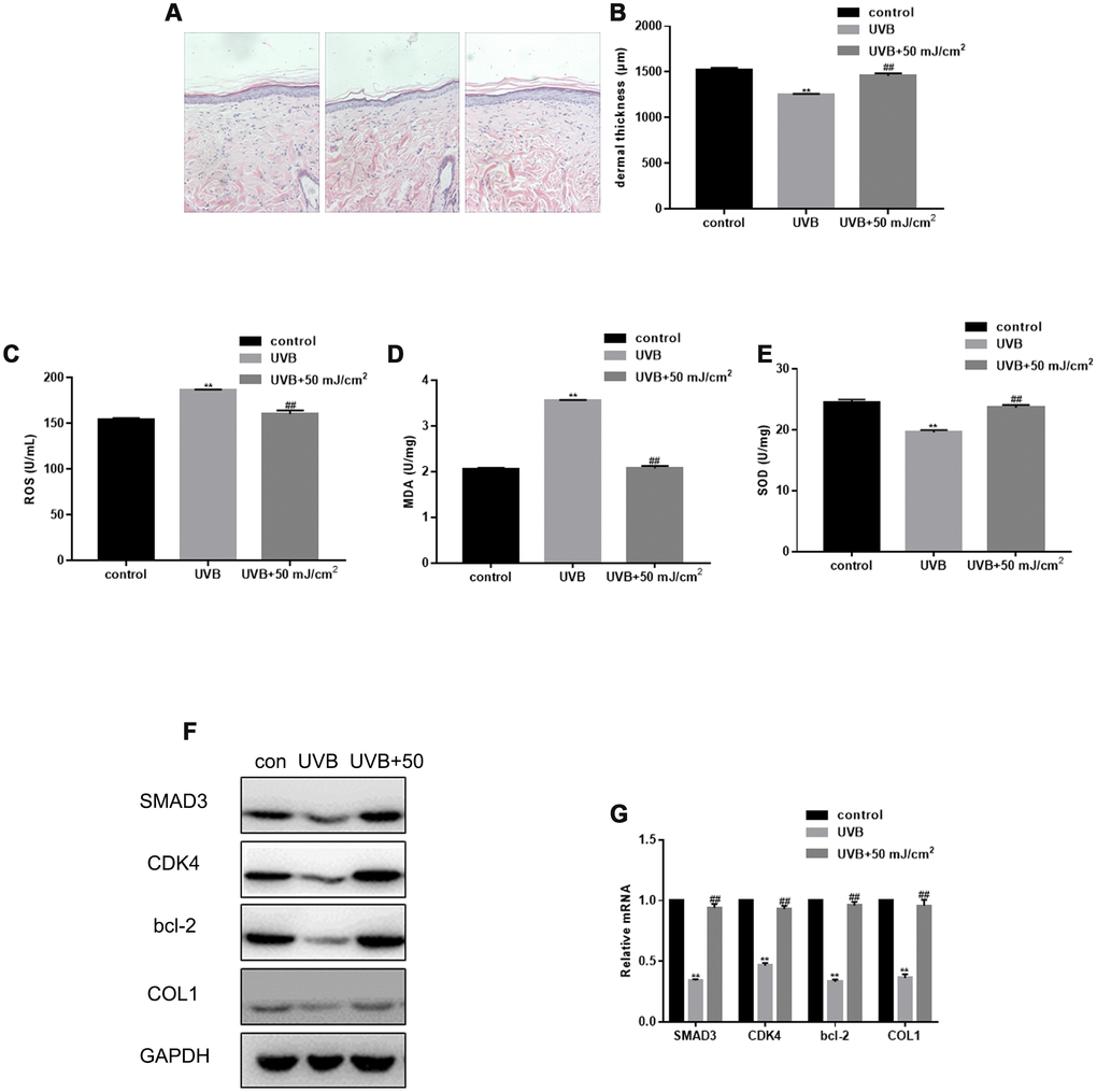 After UVB irradiation of rat skin, the dermis became thinner and the skin structure was disordered. In the control group, the structure of the epidermis was complete, the cell layers were clear, the thickness of the dermis was normal, the wavy fibrous tissues could be seen clearly, and the distribution was uniform and dense. However, after UVB irradiation, the epidermis was thickened with hyperkeratosis, had an unclear cell stratification, uneven distribution and disordered arrangement of cortical fibers, the diameter of collagen fibers increased, and inflammatory cells infiltrated the cross section. Importantly, in the treatment group, the thickness of skin and dermis significantly increased, and new, dense, and fine collagen fibers appeared in the superficial dermis, while some denatured and curly fibers were metabolized (Figure 4A, 4B). CO2 lattice laser treatment down-regulated the expression of ROS and MDA induced by UVB irradiation (Figure 4C, 4D). In addition, CO2 lattice laser treatment up-regulated the SOD expression reduced by UVB irradiation (Figure 4E). After CO2 lattice laser irradiation, the tissue expression of SMAD3, CDK4, Bcl-2, and COL1 significantly increased compared with the UVB irradiation group (Figure 4F, 4G).