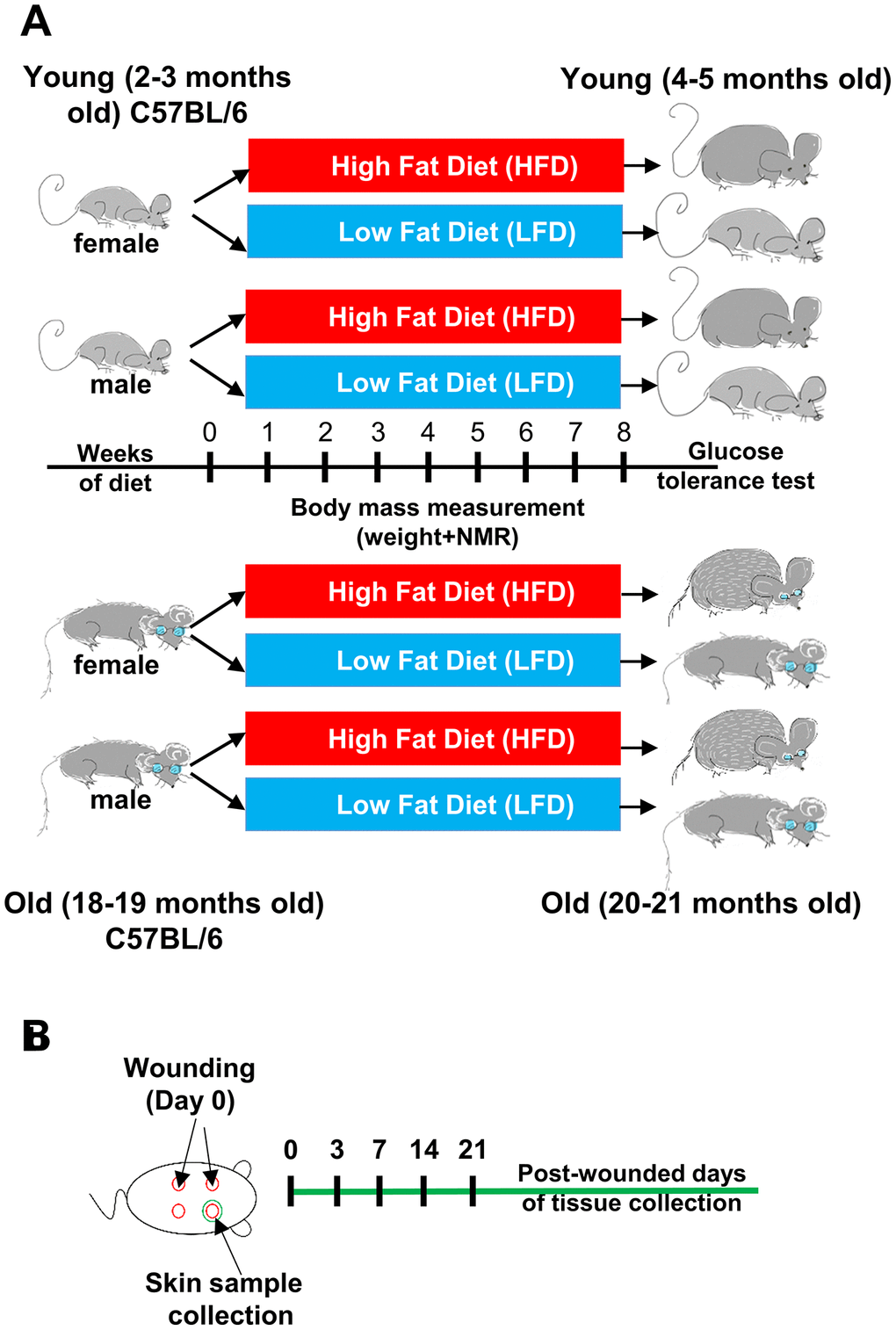 While the ability of individual biological factor, such as age or obesity, to disrupt subsequent phases of wound repair have been described, comprehensive analyzes examining the combined effects of age, sex and obesity on cutaneous wound healing are limited. Hence, the present study was designed to explore the effect of age, sex and LFD vs HFD on skin wound healing in C57BL/6J (B6) mice.