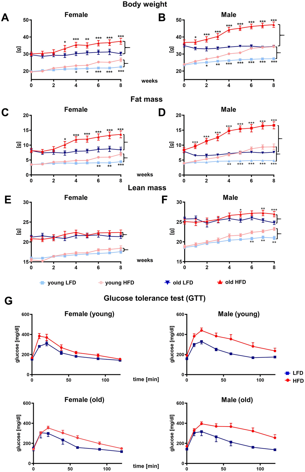 The lean mass content did not change substantially during the 8 weeks of feeding study in the young or old females (Figure 2E). Interestingly, for males fed HFD, the lean mass content increased (Figure 2F) indicating that both fat and lean mass contributed to overall body weight gains (Figure 2B; Supplementary Table 7–9). The glucose tolerance test (GTT) performed at the end of the 8th week showed impaired glucose tolerance for HFD mice which was most severe for males (Figure 2G).