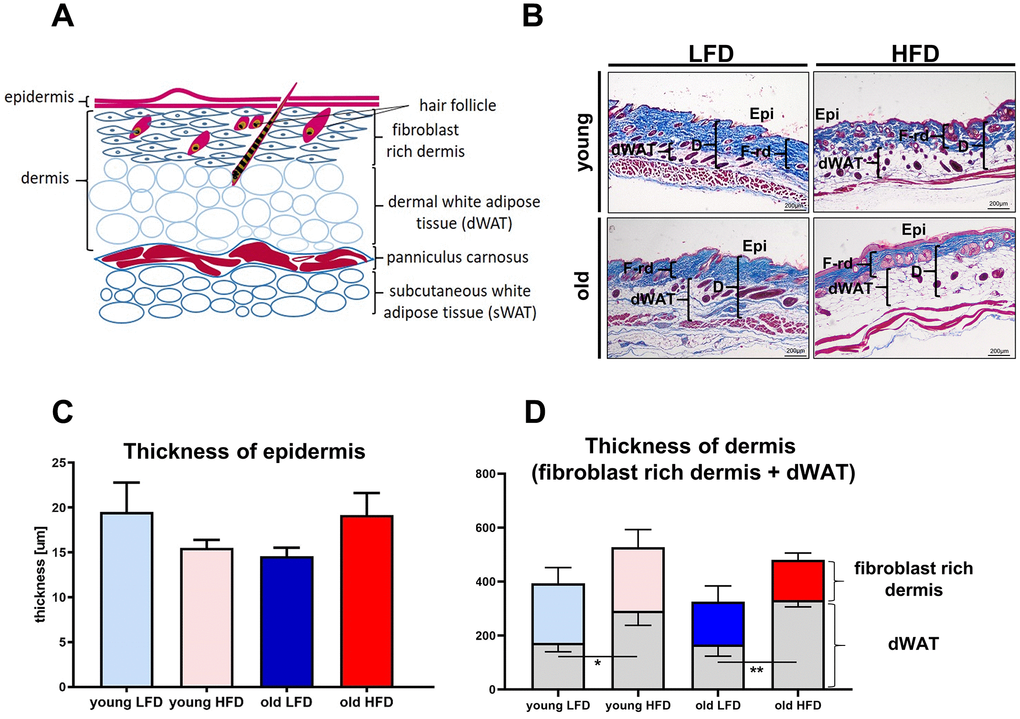 To analyze the impact of age and diet on the skin of young and old mice after LFD or HFD, we performed histological measurements of the thickness of the epidermis, the dermis, and the dWAT (Figure 3A). The thickness of epidermis demonstrated no significant differences (Figure 3B–3D) among analyzed groups. The measurement of the total dermis thickness (comprising the fibroblast-rich dermis + dWAT) showed increases in mice fed HFD regardless of age (Figure 3B, 3D, Supplementary Table 10). While measurements of the fibroblast-rich dermis alone decreased in old animals, regardless of diet (Figure 3B, 3D; Supplementary Table 13), the increase in dWAT thickness, as a result of HFD in old mice, compensated for the loss of fibroblast rich dermis (Figure 3B, 3D; Supplementary Tables 11, 12). As a consequence, dermal layer was significantly thicker in HFD relative to LFD old mice and comparable to that observed in young, HFD animals (Figure 3B, 3D).