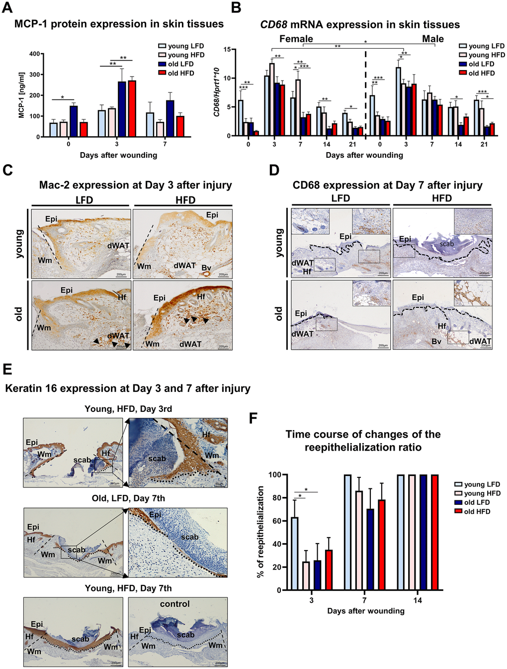 Skin wound healing occurs in overlapping but distinct stages characterized by inflammation, new tissue formation and remodelling [2]. The inflammatory phase is marked by recruitment to the wound of monocytes which subsequently differentiate into macrophages and together with resident cells (keratinocytes at the wound edge, fibroblasts and endothelial cells) produce MCP-1 (monocytes chemoattractant protein 1), a strongly chemotactic cytokine [26] which further mediates the recruitment of monocytes, mast cells and lymphocytes to the site of injury [27]. To assess the inflammatory phase of skin wound healing in different mice cohorts we measured levels of MCP-1 (Figure 4A), the expression of CD68 mRNA (Figure 4B) and the immunohistochemical localization of macrophage markers: Mac-2 (galectin-3) (Figure 4C) and CD68 (Figure 4D) in skin tissues. The peak of MCP-1 levels was detected at day 3 after wounding (Figure 4A; Supplementary Table 14). Skin injury in old mice evoked the highest levels of MCP-1 that was not affected by diet (LFD vs HFD) (Figure 4A; Supplementary Table 15). CD68 mRNA analysis revealed the highest levels of expression at post-wounded day 3 which gradually decreased as the skin wound healing process progressed to day 21, falling to levels comparable to those expressed by uninjured skin (Figure 4B, Supplementary Tables 16–19). Interestingly, in contrast to MCP-1, the highest levels of CD68 mRNA expression were detected for young mice, regardless sex (Figure 4B, Supplementary Table 19). The effect of age and diet on CD68 mRNA expression was apparent throughout the skin wound healing process (days 3-21) (Supplementary Table 19). Immunohistological localization of Mac-2 positive cells was identified in the epidermal layer, consistent with reports associating Mac-2 epidermal expression with differentiation and maturation of suprabasal keratinocytes [28] in the wound area, in granulation tissues and in the wound margin (Figure 4C). The accumulation of Mac-2 positive cells was observed in skin sections collected at day 3 (Figure 4C) and, to a lesser extent, day 7 (data not shown) after injury. The most robust infiltration of Mac-2 was observed in old HFD mice (Figure 4C). CD68 immunoreactivity was exclusively detected in the dermal part of the skin after wounding (Figure 4D). Positivity for CD68 was observed among cells spread throughout the post wounded dermis, blood vessels and some adipose tissue (Figure 4D). The strongest CD68 reaction product deposition at post wounded day 7 was observed in dWAT tissues localized at wound margin of old HFD mice (Figure 4D).