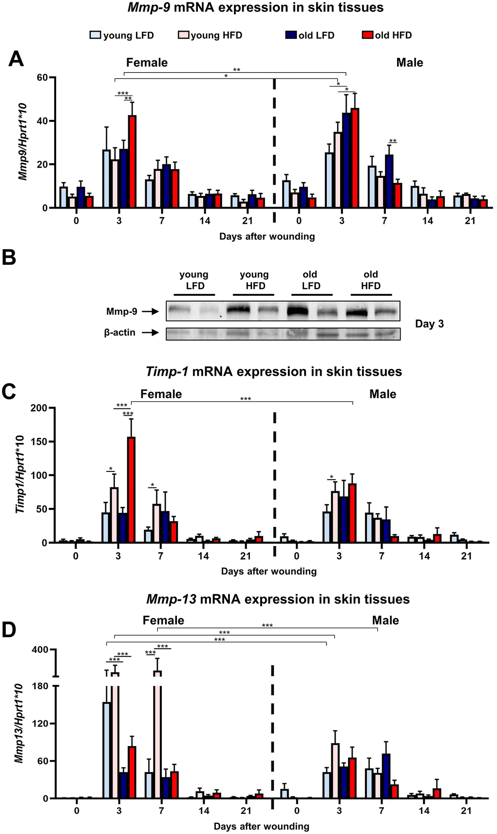 The skin wound healing process is tightly coordinated by Mmps enzymes [31]. Mmps function as regulators of each phase of skin wound healing contributing to the inflammatory and remodelling stages through their participation in the degradation of structural extracellular matrix (ECM) components, activation of other Mmps, release of growth factors from the cell membrane or ECM, and the shedding of cell adhesion molecules [32]. The analysis of Mmp-9 (Figure 5A; Supplementary Tables 23–26) and Timp-1 (Figure 5C; Supplementary Tables 27–30) revealed a surge in mRNA expression in post-injured skin tissues at day 3 for both males and females followed by their gradual decrease to reach the initial baseline (day 0) levels at day 14. The highest levels of Mmp-9 mRNA expression at post wounded day 3 was observed for old HFD mice, indicating the impact of two parameters: age and diet (Figure 5A; Supplementary Tables 23–26). The surge in Mmp-9 expression at day 3 accompanied a burst of Timp-1 mRNA where Timp-1 expression was higher for old HFD females relative to males (Figure 5C; Supplementary Tables 27–30). The combined effect of: diet, age and sex was detected at day 3rd after wounding for Timp-1 mRNA surge (Figure 5C; Supplementary Tables 27–30). The analysis of Mmp-9 protein expression at day 3 by Western blot confirmed that age and HFD diet stimulated its expression (Figure 5B).
