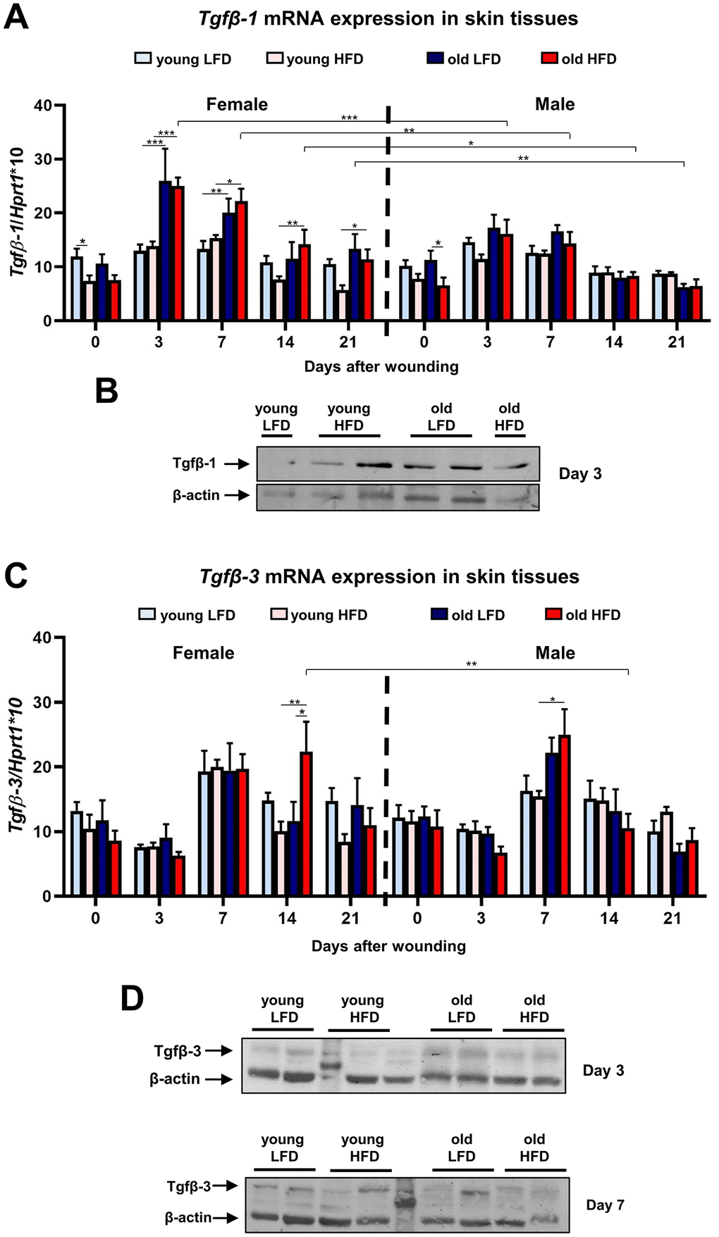 Other factors that affect the skin wound healing process are transforming growth factors beta 1 and 3 (Tgfβ-1 and Tgfβ-3). Tgfβ-1, so called pro-scarring, is one of the first cytokines to elicit inflammatory cell recruitment. The skin wound healing process evokes Tgfβ-1 mRNA (Figure 6A) and protein (Figure 6B) expression at post-wounded days 3 and 7. The highest expression of Tgfβ-1 was detected in post-wounded skin from old female mice regardless of diet (Figure 6A). The upregulated Tgfβ-1 gene expression at day 3 (p<0.001), 7 (p<0.01) and 14 (p<0.05) is substantially greater in old HFD females than relative to old HFD males (Figure 6A; Supplementary Tables 35–38). The expression levels of Tgfβ-3, a cytokine which plays an important role in wound repair and is presumed to be a potential mediator of scar reduction and skin healing improvement [34], showed the increase for both females and males at post-wounding day 7 (Figure 6C, 6D; Supplementary Tables 39–42). For old HFD females Tgfβ-3 mRNA expression remained elevated at day 14 after injury (Figure 6C) indicating the interaction among: sex (female) and diet (HFD) and post-wounding day (day 14) (Supplementary Table 42).