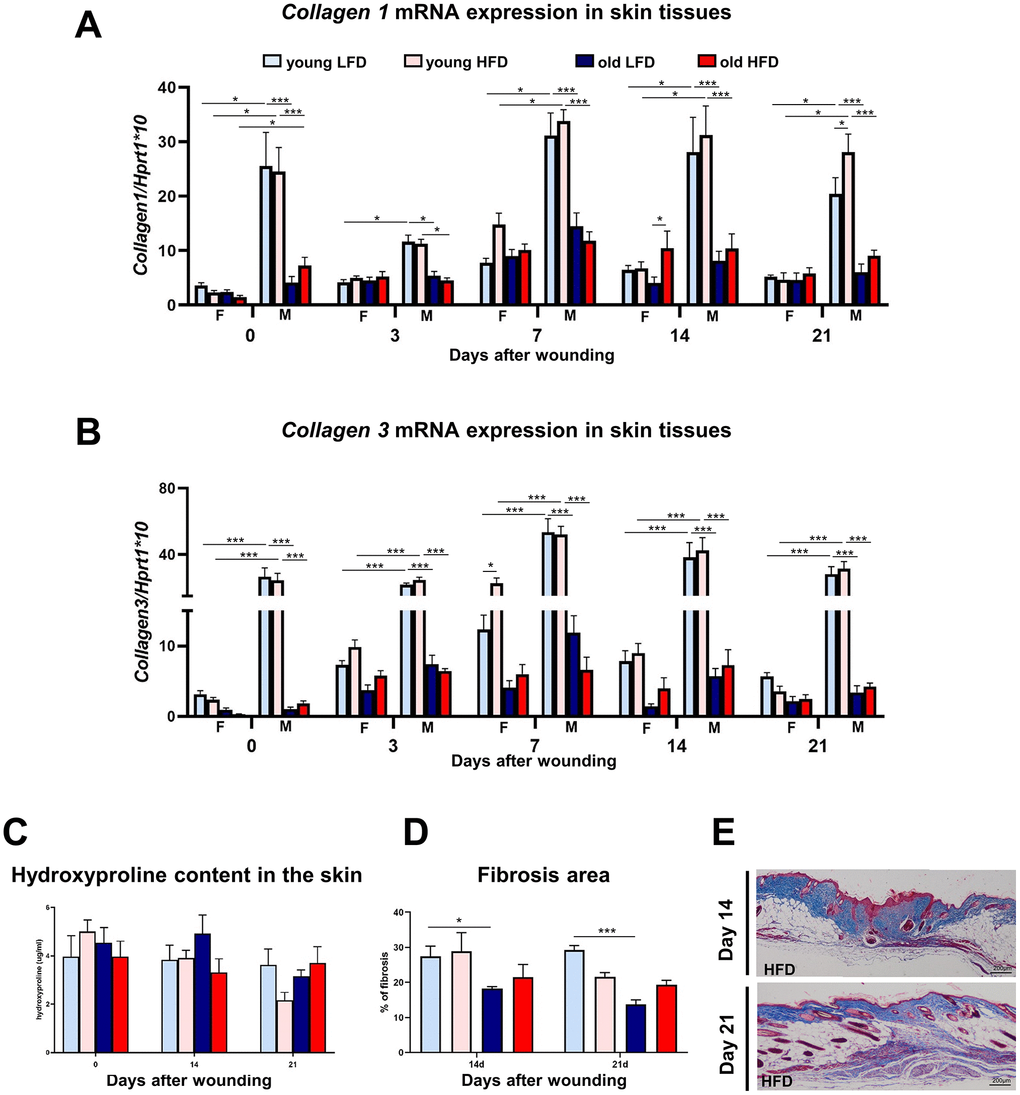The restoration of post-injured skin tissues requires collagen biosynthesis and turnover that affect the post-wounded skin quality and outcome. To evaluate collagen content during skin wound healing, we analyzed collagen 1 and 3 mRNA expression, total collagen content through hydroxyproline assays, and analysis of post-wounded area on Masson’s trichrome stained histological sections (Figure 7). The highest levels of collagen 1 and 3 mRNA in uninjured and post-injured skin tissue samples were detected in young male mice (Figure 7A, 7B, Supplementary Tables 43–50) whereas the expression in aged males was significantly lower and comparable to young and old females (Figure 7A, 7B; Supplementary Tables 43–50). Evidently, age (young) and sex (males) but not diet have the combined effect on the collagen1 and 3 gene expression in the skin (Figure 7A–7B; Supplementary Table 46–50). Further analysis of collagen was performed through hydroxyproline content measurement (Figure 7C) and the histological analysis of Masson’s Trichrome stained skin sections (Figure 7D, 7E) at post-wounded day 14 and 21. The combined effect of age and diet for hydroxyproline content was detected at day 21 after wounding (Supplementary Table 51). The highest percentage of fibrosis area analyzed in histological sections was quantified for young and low fat diet mice at both day 14 and 21 (Figure 7D, 7E; Supplementary Tables 52, 53).