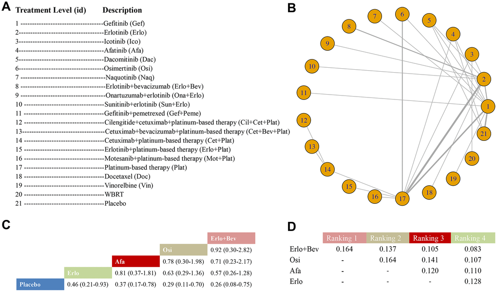 Figure 1. Meta-analysis of efficacy for PFS at the individual-treatment level. (A) Descriptions of the individual treatments included in this analysis. (B) Network plots showing comparisons between nodes (yellow circles), each representing a unique individual treatment. Each line corresponds to direct comparisons between treatments with the width corresponding to the number of direct within-trial comparisons. (C) Comparison results of the most efficacious treatments and placebo (HR (95% CrI)). Each result is a comparison between the column-defining drug and the row-defining treatment. (D) Schematic detailing the most efficacious treatments according to the rankograms.