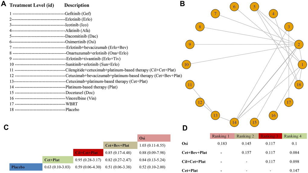 Figure 2. Meta-analysis of efficacy for OS at the individual-treatment level. (A) Descriptions of the individual treatments included in this analysis. (B) Network plots showing comparisons between nodes (yellow circles), each representing a unique individual treatment. Each line corresponds to direct comparisons between treatments, with the width corresponding to the number of direct within-trial comparisons. (C) Comparison results of the most efficacious treatments and placebo (HR (95% CrI)). Each result is a comparison between the column-defining drug and the row-defining treatment. (D) Schematic detailing the most efficacious treatments according to the rankograms.