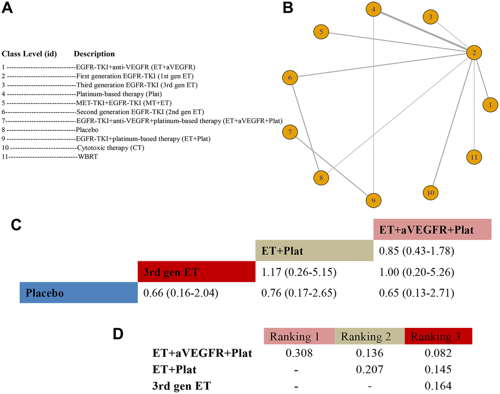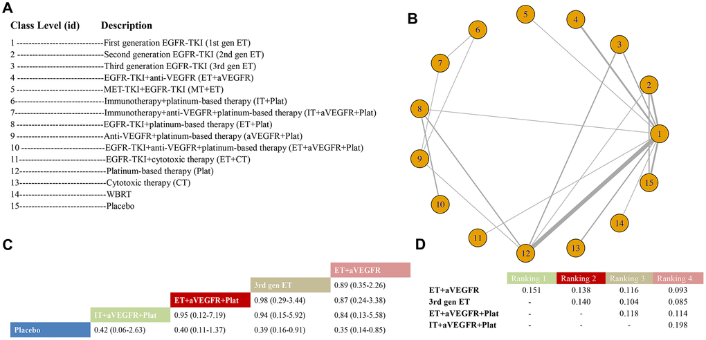To organize the current treatment options in clinical trials into clinically meaningful arms, we used general prespecified criteria, as shown in Table 1. Cilengitide (Cil) and cetuximab (Cet) are seldom used in NSCLC, and for statistical convenience and network simplification, Cil is categorized in the aVEGFR class, and Cet is categorized in the ET class [48].