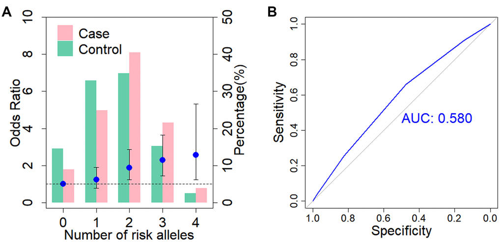 Lastly, we investigated whether there was a cumulative genetic effect with respect to the disease risk for ADD3 SNP rs17095355 and GPC1 SNP rs6707262 (Figure 3). The individuals can be divided into four classes according to the number of risk alleles that they carry (Figure 3A). There is an increase in ORs for BA occurrence with the increasing number of risk alleles against the baseline group of individuals carrying no risk alleles. Those carrying four risk alleles were more than twice as likely to have BA (OR = 2.56, 95% CI = 1.23-5.32; Supplementary Table 2) compared with those carrying none. We then evaluated the discriminatory power of a genetic test based on these two susceptibility SNPs by calculating the area under the receiver operating characteristic (ROC) curve, and the area under the curve (AUC) was estimated to be 0.58 (Figure 3B).