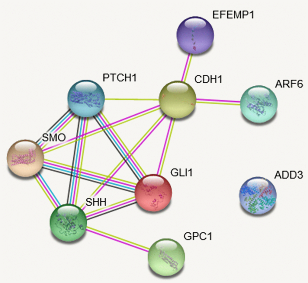 We explored PPI using STRING database (http://string-db.org/) [36]. Four studied genes (ADD3, GPC1, ARF6, and EFEMP1) and Hedgehog pathway genes were used to query STRING database. The PPI relationships were analyzed on the STRING database with the required confidence (combined score) > 0.4 as the threshold. After the PPIs were searched, the PPI network was constructed on STRING website.