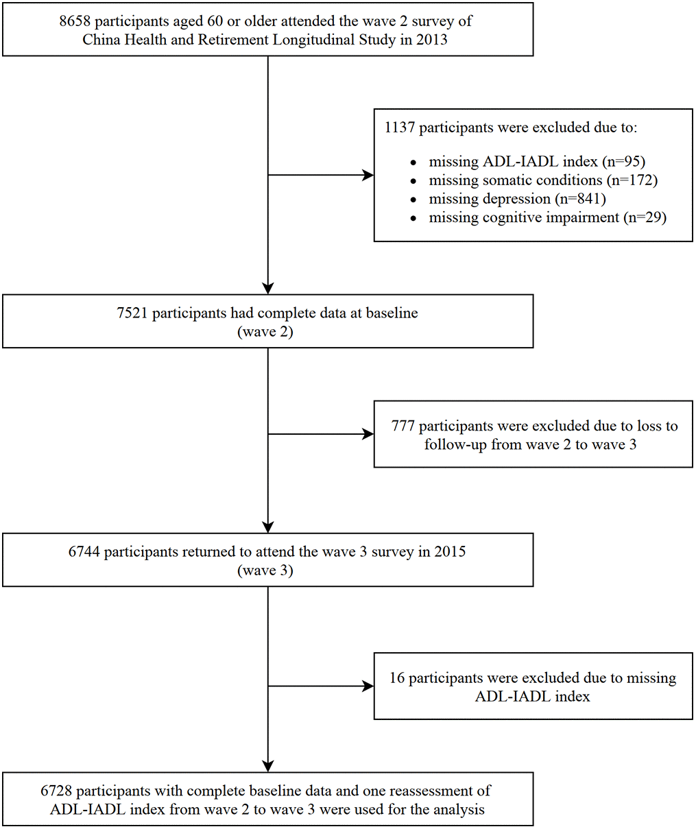 In Wave 2 (2013), 18612 individuals aged 45 years or over were initially included. The current analysis was limited to 8658 participants who were younger than 60 years of age. We excluded participants who had incomplete data related to the assessment of chronic diseases, depression, cognitive function, disability at baseline, follow-up or loss to follow-up in Wave 3 (2015). Finally, a sample of 6728 participants was included in the current analysis. A flowchart of the selected participants is shown in Figure 2.