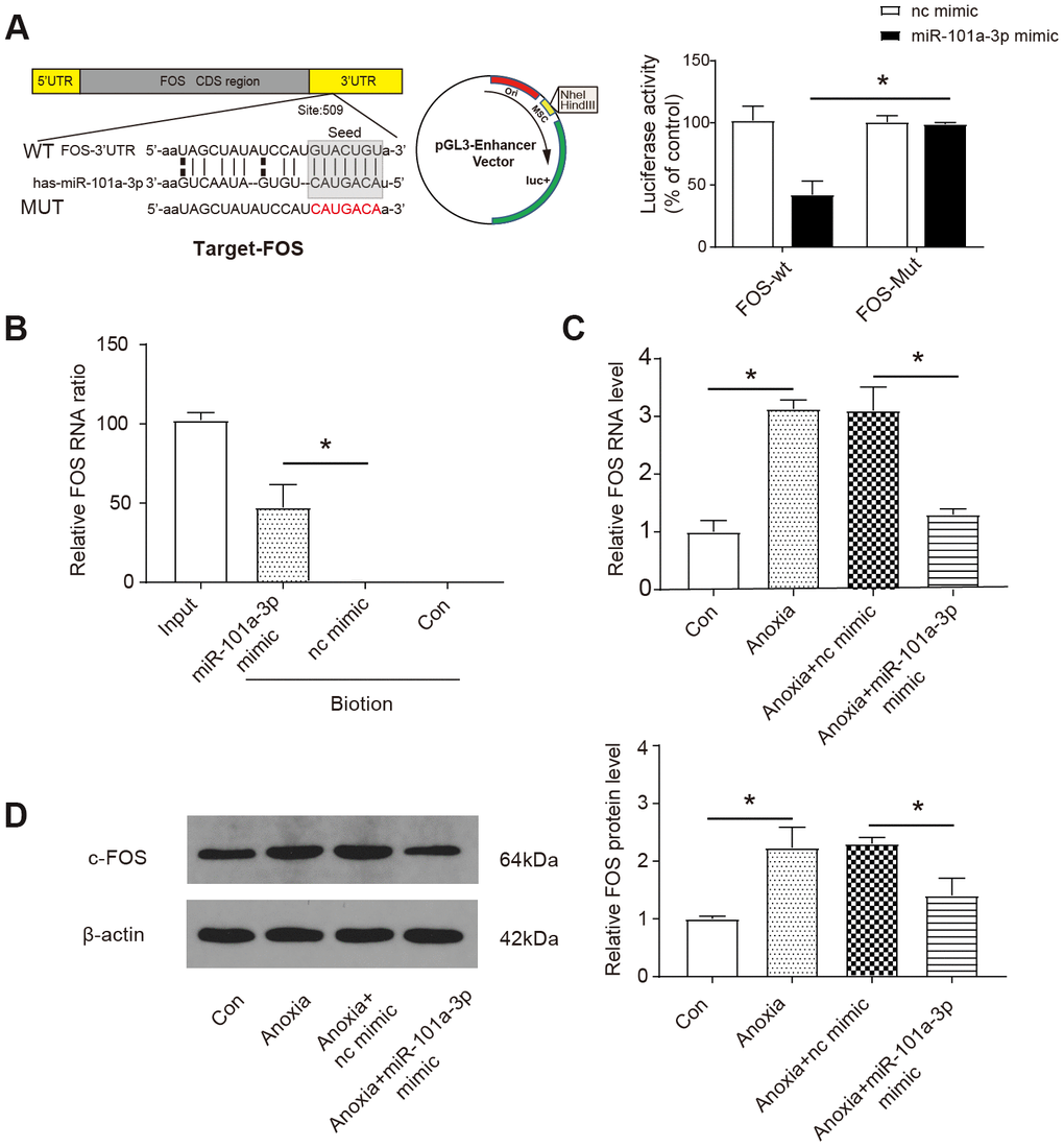 Next, we aimed to identify the downstream target of miR-101a-3p. According to the bioinformatics databases (http://www.microrna.org/), we identified a potential target relationship between miR-101a-3p and FOS. The luciferase reporter assay revealed that the wild-type 3’-UTR of FOS exhibited a low translation level in the presence of miR-101a-3p, whereas the mutated 3’-UTR did not show a significant response to miR-101-3p (P< 0.05, Figure 3A). Moreover, the specific binding between miR-101a-3p and FOS was further verified by affinity pull-down of FOS through pull down assay. As our data shows, 51 % of FOS was detected in the pull-down mixture, which was significantly higher than that in nc mimic group (P< 0.05, Figure 3B). Confirming that FOS was a target of miR-101a-3p, we then explored the regulatory effect of miR-101a-3p on FOS by qRT-PCR. As shown in Figure 3C, the FOS RNA level was significantly upregulated under anoxia condition and application of miR-101a-3p mimic reversed the upregulation (P<0.05). The protein product of FOS, c-FOS, was measured by western blot. Similarly, the c-FOS level increased under anoxia condition and the upregulation was suppressed by miR-101a-3p mimic (P<0.05, Figure 3D). According to the above experimental data, we determined that miR-101a-3p participates in the regulation of FOS expression by targeting to miR-101a-3p.