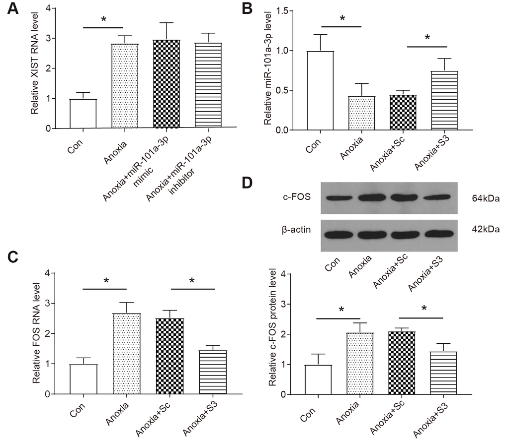 Confirming the target relationship among XIST, miR-101a-3p and FOS, we then investigated how XIST regulated the expression of its downstream targets. As Figure 4A shows that the expression level of lncRNA XIST was significantly upregulated in NMCMs under anoxia condition and the up-regulation was not affected by application of miR-101a-3p mimic or inhibitor. In contrast, the level of miR-101a-3p was significantly reduced under anoxia condition and transfecting cells with XIST siRNAs (S3) significantly improved miR-101a-3p expression under anoxia condition (P<0.05, Figure 4B). On the other hand, the level of FOS mRNA was increased in anoxia cells and the upregulation was suppressed in the XIST siRNAs group under anoxia condition both at the protein and mRNA levels (P<0.05, Figure 4C, 4D). To sum up, the upregulation of XIST expression under anoxia condition promoted the FOS expression by targeting and suppressing the expression of miR-101a-3p.