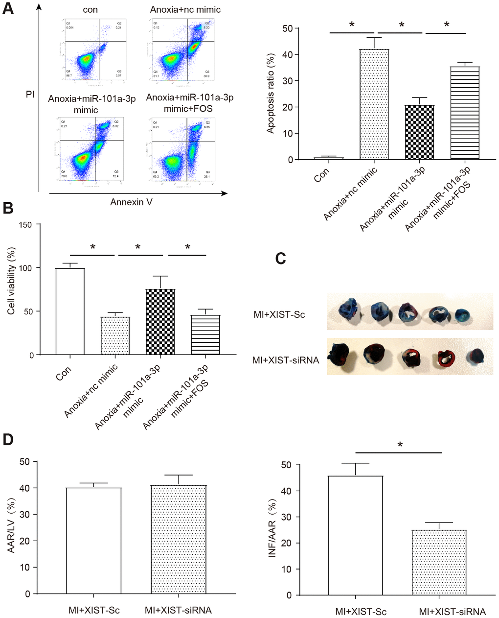 In order to explore whether the target genes miR-101a-3p and FOS in the downstream of XIST could affect anoxia-induced NMCMs apoptosis and cell viability, we transfected miR-101a-3p into NMCMs and overexpressed the FOS at the same time to determine whether miR-101a could directly regulate FOS to affect the apoptosis and viability of NMCMs. As shown in Figure 5A, the apoptosis rate was significantly increased under anoxia condition and application of miR-101a-3p mimic could protect cells against apoptosis in certain degree (P<0.05). Moreover, as assumed before, the application of FOS contradicted the protection effect of miR-101a-3p mimic (P<0.05). Similarly, anoxia significantly decreased the cell viability and miR-101a-3p mimic also had a protective effect (P<0.05, Figure 5B), at the same time FOS reversed the positive effect of miR-101a-3p to some extent. To understand the role of XIST in the mice model of myocardial infarction, we performed MI in the mice model and evaluated the effects of inhibiting XIST on cardiac damage by TTC staining (Figure 5C). Our results showed that the mice treated with XIST-siRNA adenoviruses exhibited a significant reduction in myocardial infarction sizes (INF/AAR) in response to MI as determined by TTC staining (P<0.05, Figure 5D). The AAR/LV ratio showed no significant statistical difference between groups, it indicates the good homogeneity of surgery. These data suggest that silencing of XIST regulates myocardial infarction and participates in mediating the signal for cell death in the heart.