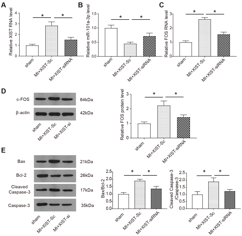 Subsequently, the expression of XIST, FOS and miR-101a-3p also the apoptosis-related proteins after inhibition of XIST were further detected in vivo. The expression of XIST, miR-101a-3p and FOS in the infarct area of the mice heart was measured by qRT-PCR. Compared to sham-operated animals, XIST and FOS were significantly upregulated in infarct heart tissues, while the XIST siRNA transfection suppressed the upregulation of XIST and FOS (P<0.05, Figure 6A, 6C). The same result was also verified in c-FOS protein expression level by western blot (Figure 6D). In contrast, the expression level of miR-101a-3p was significantly decreased as a consequence of MI and XIST siRNA transfection improved the level miR-101a-3p in infract heart tissues (P<0.05, Figure 6B). The protein level of apoptosis-associated proteins were measured by western blot. The expression of pro-apoptotic protein Bax and cleaved caspase-3 [24] was increased in infract heart tissues, while in vivo XIST siRNA transfection decreased the upregulation of these proteins (P<0.05, Figure 6E). Based on this part of the experimental results, we concluded that decreasing XIST expression could protect mice from myocardial infarction and cardiomyocyte apoptosis in some degree by down-regulating the expression of c-FOS and apoptosis-related proteins.