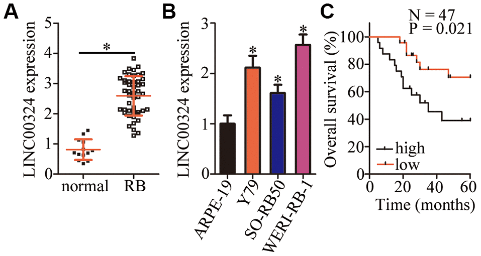 To study the specific functions of LINC00324 in RB, we first quantified the expression of this lncRNA in 47 RB tissue samples and 13 normal retinal tissue samples. The results of reverse-transcription quantitative polymerase chain reaction (RT-qPCR) made it clear that LINC00324 was overexpressed in RB tissue samples relative to that in normal retinal tissues (Figure 1A, P < 0.05). We also determined LINC00324 expression in three RB cell lines (Y79, SO-RB50, and WERI-RB-1) and in a normal retinal pigmented epithelial cell line, ARPE-19. The expression of LINC00324 was markedly higher in all three RB cell lines compared with that in ARPE-19 cells (Figure 1B, P < 0.05).