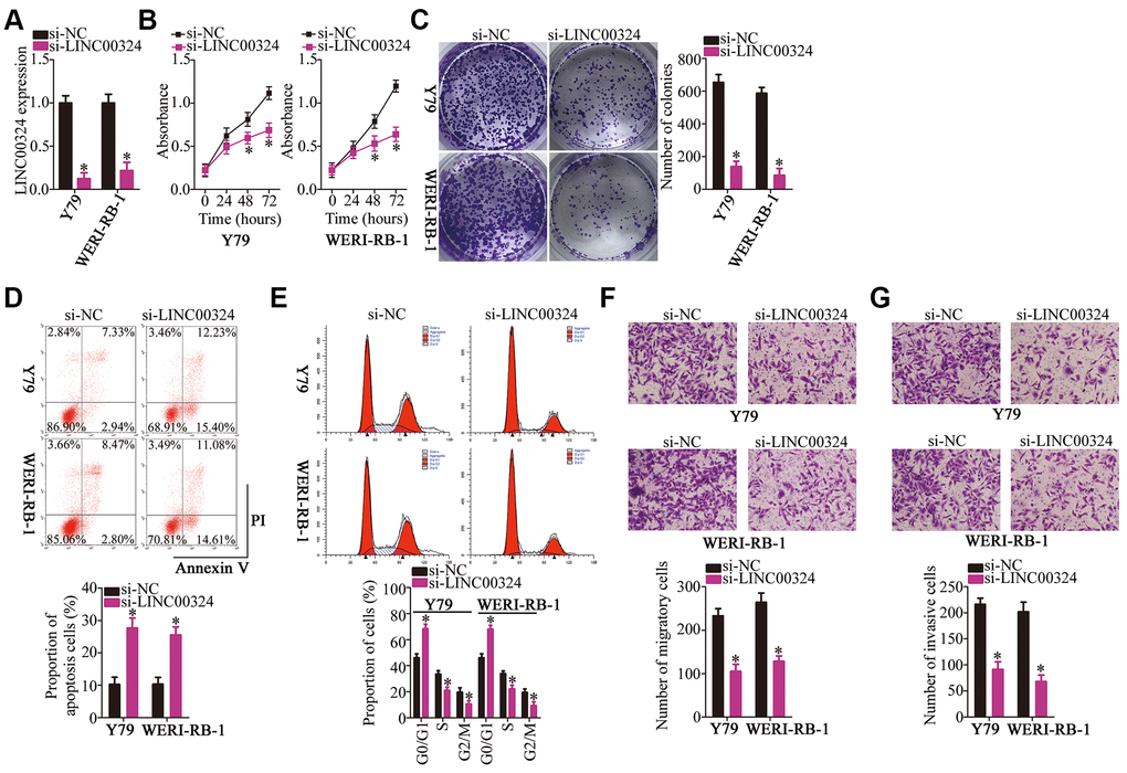 The cell lines Y79 and WERI-RB-1, which demonstrated the highest expression of LINC00324 among the three RB cell lines, were selected for the subsequent experiments, and were transfected with either small interfering RNA (siRNA) targeting LINC00324 (si-LINC00324) or a negative control siRNA (si-NC). The levels of LINC00324 reduced significantly in Y79 and WERI-RB-1 cells after treatment with si-LINC00324, as evidenced by RT-qPCR (Figure 2A, P < 0.05). A Cell Counting Kit-8 (CCK-8) assay was used to investigate the effect of LINC00324 downregulation on the proliferation of RB cells. Transfection with si-LINC00324 clearly decreased the proliferative ability of Y79 and WERI-RB-1 cells (Figure 2B, P < 0.05). Consistent with this result, a colony formation assay indicated that LINC00324 knockdown significantly decreased the colony-forming ability of Y79 and WERI-RB-1 cells (Figure 2C, P < 0.05).