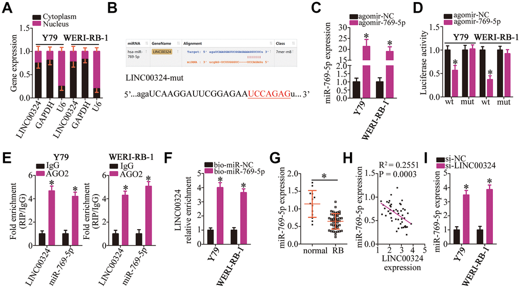 Growing evidence suggests that lncRNAs can competitively bind to certain miRNAs and relieve the repressive actions of these miRNAs on the expression of their target genes [37]. To illustrate the mechanisms underlying the oncogenic activities of LINC00324 in RB cells, we first determined the localization of LINC00324. As presented in Figure 3A, LINC00324 was mainly located in the cytoplasm of Y79 and WERI-RB-1 cells, indicating that LINC00324 may act as a ceRNA for certain miRNAs in RB cells. We therefore tried to predict whether the miRNAs could interact with LINC00324 using starBase 3.0. MiR-769-5p contains sequences that are complementary to LINC00324; the predicted site for miR-769-5p binding in LINC00324 has been depicted in Figure 3B. MiR-769-5p has been reported to be downregulated and to function as a tumor-suppressive miRNA in multiple human cancer types [29, 30].