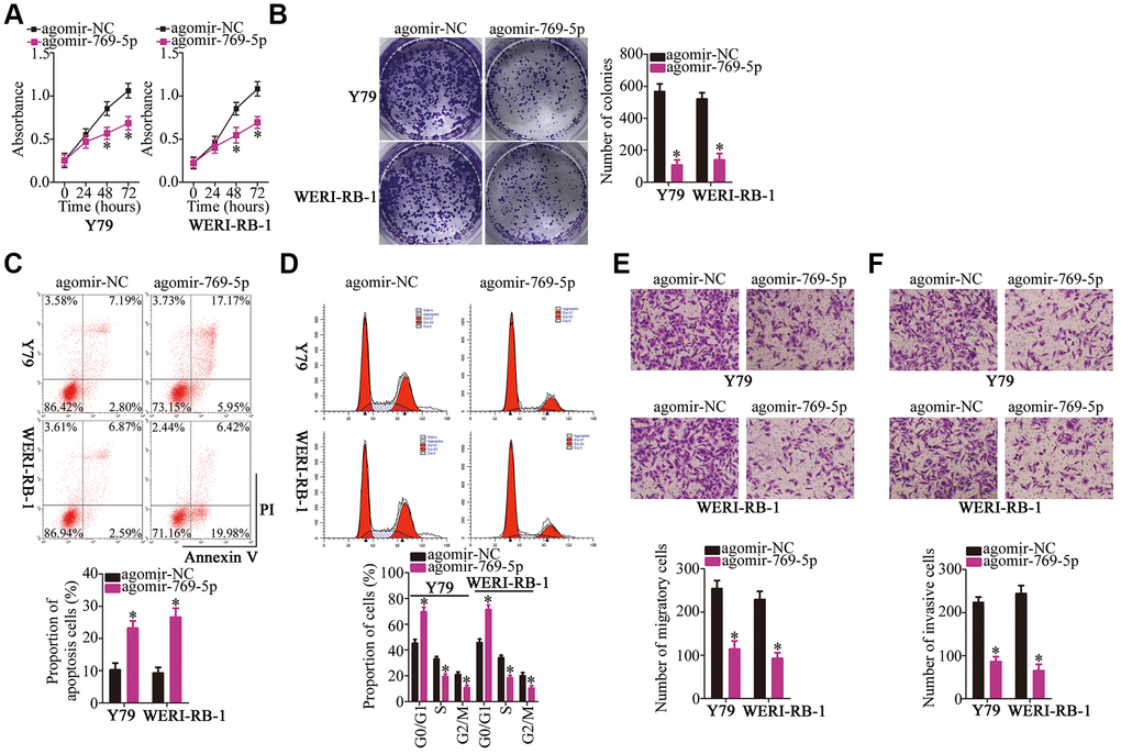 To further investigate the association of miR-769-5p with the malignant characteristics of RB cells, agomir-769-5p was transfected into Y79 and WERI-RB-1 cells to increase the expression of endogenous miR-769-5p. Transfection with agomir-NC served as the control. Then, a CCK-8 assay, colony formation assay, and flow cytometry were carried out to determine cell proliferation, colony formation, and apoptosis status, respectively, of miR-769-5p–overexpressing Y79 and WERI-RB-1 cells. Ectopic expression of miR-769-5p clearly inhibited the proliferation and colony formation ability of Y79 and WERI-RB-1 cell proliferation (Figure 4A, 4BP < 0.05), and promoted apoptosis (Figure 4C, P < 0.05) and G0–G1 cell cycle arrest (Figure 4D, P < 0.05). In addition, the overexpression of miR-769-5p decreased the migration (Figure 4E, P < 0.05) and invasiveness (Figure 4F, P < 0.05) of Y79 and WERI-RB-1 cells, as determined by the Transwell migration and invasion assays. Collectively, these findings demonstrate that miR-769-5p inhibited the malignant phenotype of RB cells in vitro.
