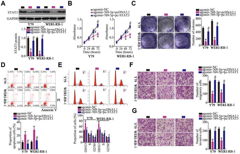 Having identified STAT3 as a direct target of miR-769-5p, we next assessed the possibility that STAT3 downregulation may be responsible for the tumor-suppressive roles of miR-769-5p in RB cells. To this end, the STAT3-overexpressing plasmid pc-STAT3 was transfected into the miR-769-5p–overexpressing Y79 and WERI-RB-1 cells. MiR-769-5p upregulation significantly suppressed STAT3 protein expression in Y79 and WERI-RB-1 cells; however, cotransfection with pc-STAT3 almost completely reversed the repression of STAT3 protein expression that was observed upon overexpression of miR-769-5p (Figure 6A, P < 0.05). Functional experiments revealed that the restoration of STAT3 expression abrogated the influence of miR-769-5p overexpression on the proliferation (Figure 6B, P < 0.05), colony formation (Figure 6C, P < 0.05), apoptosis (Figure 6D, P < 0.05), cell cycle statues (Figure 6E, P < 0.05), migration (Figure 6F, P < 0.05), and invasiveness (Figure 6G, P < 0.05) of Y79 and WERI-RB-1 cells. Collectively, these data suggest that miR-769-5p attenuated the growth and metastasis of RB cells in vitro, at least partly, by downregulating STAT3.