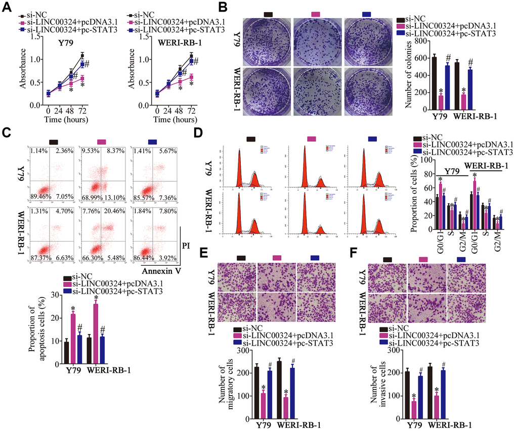 What's more, rescue experiments were designed and conducted to further prove that whether STAT3 mediates the oncogenic actions of LINC00324 in RB cells. To this end, pcDNA3.1 or pc-STAT3 alongside si-LINC00324 was cotransfected into Y79 and WERI-RB-1 cells. LINC00324 silencing strikingly suppressed Y79 and WERI-RB-1 cell proliferation (Figure 8A), colony formation (Figure 8B) and promoted cell apoptosis (Figure 8C) and cell cycle arrest (Figure 8D), while pc-STAT3 cotransfection abrogated these influences. Also, reintroduction of STAT3 attenuated LINC00324 knockdown induced suppression on Y79 and WERI-RB-1 cell migration (Figure 8E) and invasion (Figure 8F). In short, these findings demonstrate that the LINC00324–miR-769-5p–STAT3 axis can regulate the behavior of RB cells in vitro.