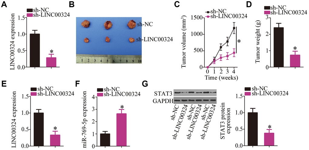Finally, a tumor xenograft model was set up to examine the impact of LINC00324 knockdown on the tumor growth of RB cells in vivo. The efficiency of sh-LINC00324 was determined by RT-qPCR (Figure 9A; P < 0.05). Nude mice were injected with Y79 cells stably expressing sh-LINC00324 or sh-NC. The tumor volumes (Figures 9B and C; P < 0.05) were markedly smaller in the sh-LINC00324 group compared with that in the sh-NC group. After four weeks, all the mice were euthanized, and the tumor xenografts were excised and weighed. The average weight of tumor xenografts harboring sh-LINC00324 was significantly lower compared with that in the sh-NC group (Figure 9D, P < 0.05). Furthermore, RT-qPCR analysis was performed on xenograft tissues. The results showed that the tumor xenografts derived from sh-LINC00324–transfected Y79 cells contained lower amounts of LINC00324 (Figure 9E, P < 0.05) and higher levels of miR-769-5p (Figure 9F, P < 0.05) compared with that in the sh-NC group. In addition, lower STAT3 protein expression was noted in the sh-LINC00324 group compared with that in the sh-NC group (Figure 9G, P < 0.05). Overall, the above data indicate that the tumor growth of RB cells in vivo was inhibited by the LINC00324 knockdown, and that this phenomenon was possibly mediated by the miR-769-5p–STAT3 axis.