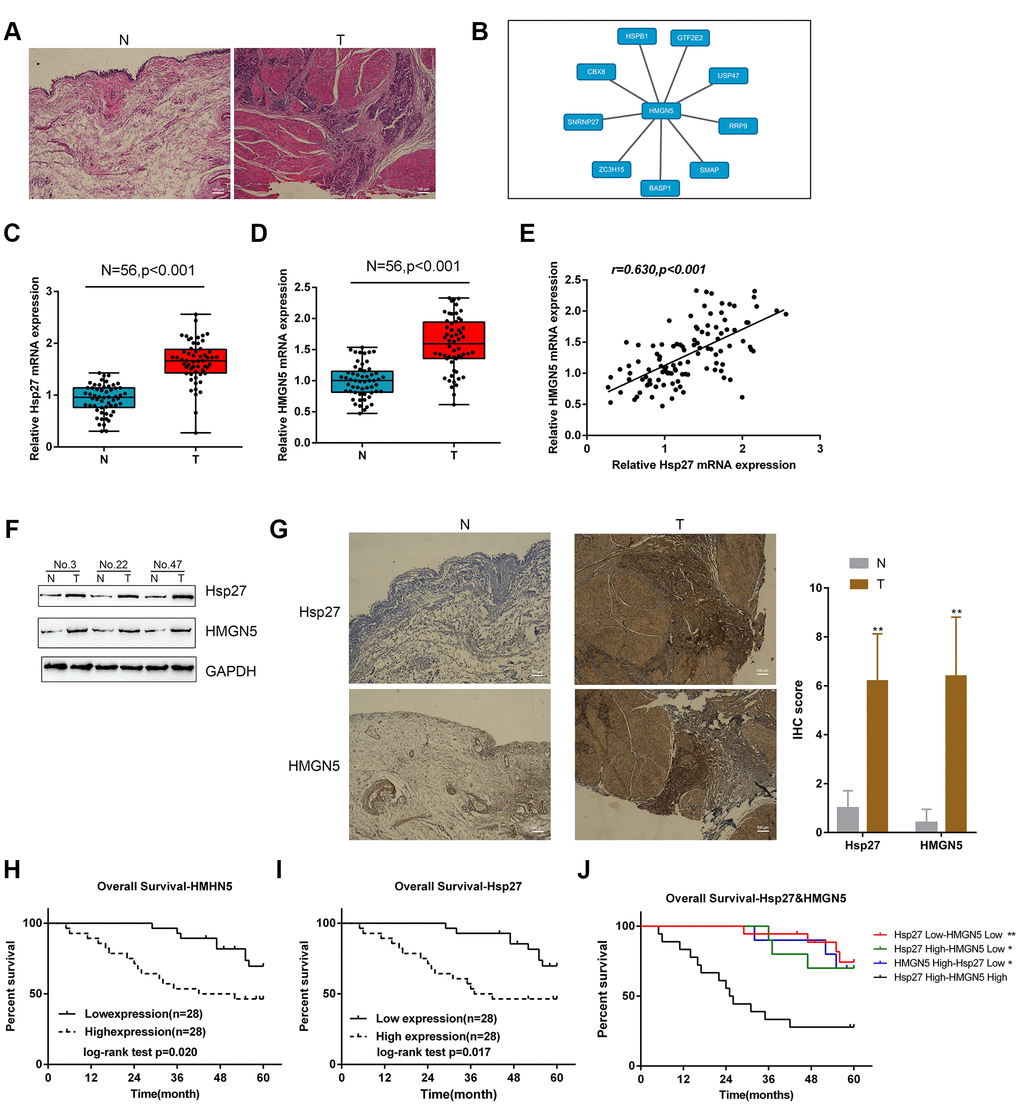Next, we analyzed the correlation of the overall survival rate with HMGN5 and Hsp27 levels. Bladder cancer patients were divided into two groups based on the expression of Hsp27 or HMGN5 using the med ian expression value as the cutoff. As shown in Figure 1H and I, lower Hsp27 or lower HMGN5 expression was related to a higher rate of overall survival in bladder cancer patients. Moreover, the group with high coexpression of HMGN5 and Hsp27 group showed the lowest overall survival rate (Figure 1J). These data suggest that HMGN5 may interact with Hsp27 to play a role in bladder cancer progression.