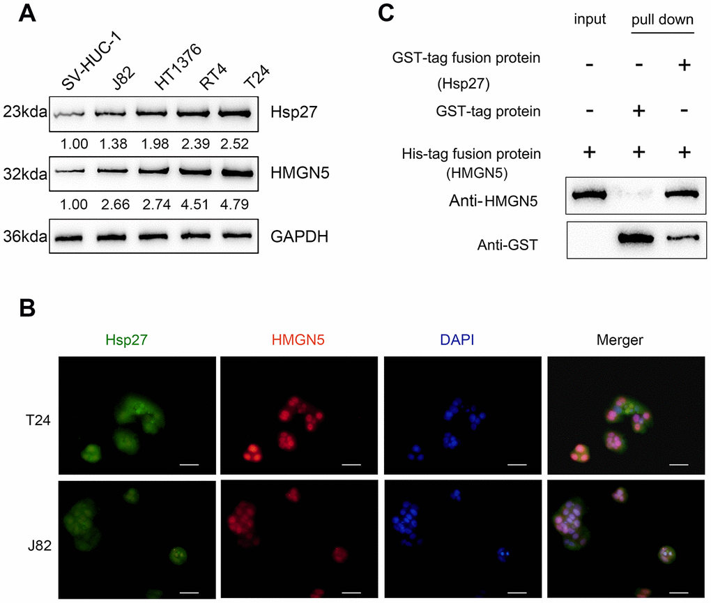 To validate the predicted interaction between HMGN5 and Hsp27, we first examined their protein levels in four bladder cancer cell lines, J82, HT1376, RT4, and T24 by immunoblotting. Figure 2A shows that the protein levels of both HMGN5 and Hsp27 in the four BC cell lines are all higher than those in the normal cell line, SV-HUC-1. IF staining images showed the fluorescence intensity representing HMGN5 (red) and Hsp27 (green) expression (Figure 2B). The merged image also revealed that HMGN5 and Hsp27 expression might be colocalized in bladder cancer cells (Figure 2B). Moreover, we conducted an in vitro GST pull-down assay to validate the predicted interaction between HMGN5 and Hsp27. We overexpressed GST-tagged Hsp27 in bacteria and incubated them with His-tagged HMGN5 at 4 °C for 4 h. HMGN5 was captured by Ni-NTA resin, and Hsp27 was detected in the precipitated product by immunoblotting, suggesting that HMGN5 could interact with Hsp27 (Figure 2C).