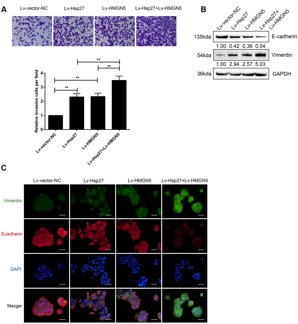 We confirmed the interaction between HMGN5 and Hsp27; then, we examined the effect of HMGN5 and Hsp27 overexpression on bladder cancer cell invasion and EMT. HMGN5 and Hsp27 overexpression was achieved in J82 cells, as confirmed by immunoblotting (Supplementary Figure 2A, 2B). Transwell assays revealed that HMGN5 or Hsp27 overexpression alone could significantly promote bladder cancer cell invasion (Figure 3A) and decrease E-cadherin expression and increase Vimentin expression (Figure 3B, 3C). More importantly, Hsp27 overexpression further enhanced the promoting effect of HMGN5 overexpression (Figure 3A–3C), suggesting that HMGN5 interacts with Hsp27 to modulate bladder cancer cell invasion and EMT.