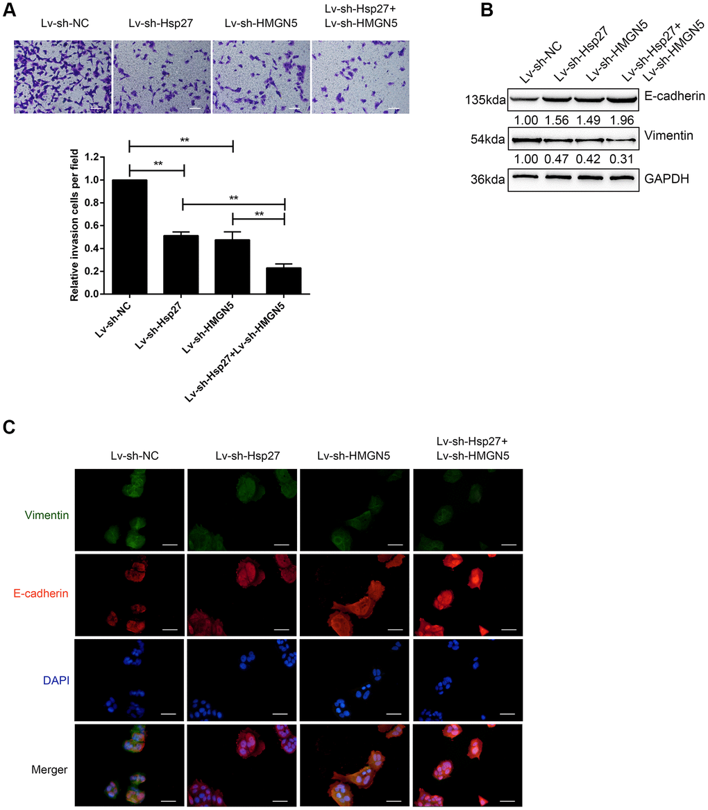 To further validate the dynamic effects of HMGN5 and Hsp27 on bladder cancer cells, we examined how HMGN5 and Hsp27 silencing affected bladder cancer cell invasion and EMT. T24 cells were infected with Lv-sh-HMGN5 or Lv-sh-Hsp27 alone to silence HMGN5 or Hsp27, as confirmed by immunoblotting (Supplementary Figure 2A, 2B). Next, T24 cells were coinfected with Lv-sh-HMGN5 and Lv-sh-Hsp27 and examined for cell invasion and EMT. In contrast to HMGN5 or Hsp27 overexpression, HMGN5 or Hsp27 silencing significantly inhibited bladder cancer cell invasion (Figure 4A) and increased the E-cadherin expression and decreased Vimentin expression (Figure 4B, 4C). Similarly, the effect of HMGN5 silencing could be enhanced by Hsp27 silence (Figure 4A–4C), further suggesting that HMGN5 interacts with Hsp27 to modulate bladder cancer cell invasion and EMT.