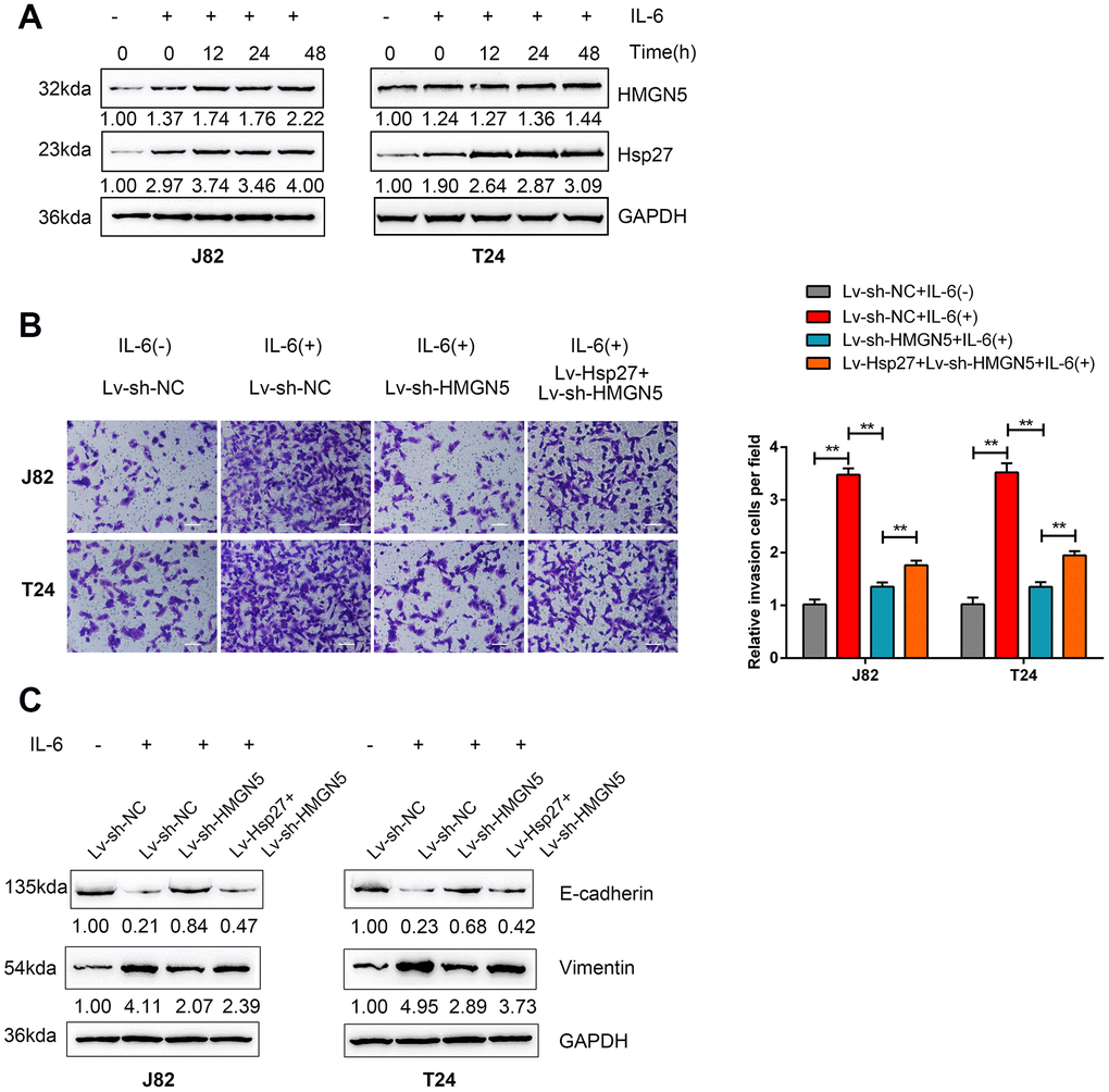 Next, J82 and T24 cells were coinfected with Lv-Hsp27 and Lv-sh-HMGN5 and examined for cell invasion and EMT markers with or without 50 ng/mL IL-6 stimulation. As shown in Figure 5B and 5C, cell invasion and EMT in both J82 and T24 cell lines could be induced by IL-6 stimulation but inhibited by HMGN5 knockdown. However, the HMGN5 knockdown-mediated suppression of cell invasion and EMT could be partially rescued by Hsp27 overexpression. These findings suggest that HMGN5 is involved in IL-6-Hsp27-induced cell invasion and EMT in bladder cancer cells.