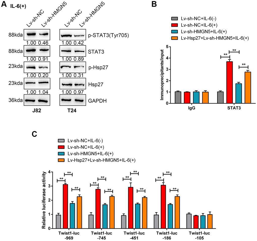 It has been reported that STAT3-mediated Twist transcription is involved in IL-6/Hsp27-mediated EMT via STAT3 targeting of the Twist promoter in prostate cancer [17]. Next, we validated whether HMGN5/Hsp27 could modulate IL-6-induced STAT3 phosphorylation and Twist promoter activity. HMGN5 silencing significantly decreased the phosphorylation of Hsp27 and STAT3 induced by IL-6 stimulation in J82 and T24 cells (Figure 6A).