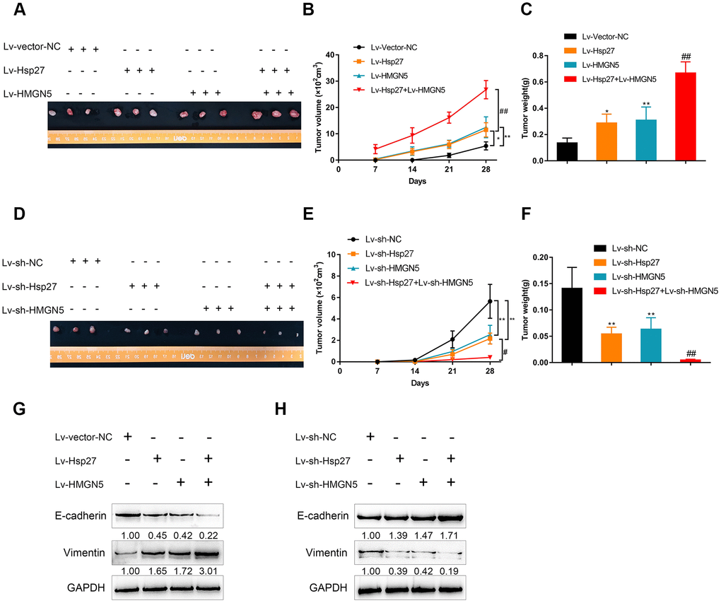 To further validate the above in vitro findings, we established a xenograft model of human bladder cancer in nude mice using HMGN5- and/or Hsp27-overexpressing or silenced J82 cells. Figure 7A shows the appearance of tumors derived from J82 cells with HMGN5- and/or Hsp27-overexpression. As shown in Figure 7B, 7C, HMGN5 or Hsp27 overexpression alone was sufficient to increase the tumor volume and tumor weight, which was further increased by the combination of HMGN5 and Hsp27 overexpression. In contrast, knockdown of Hsp27 or HMGN5 alone clearly decreased restrained the tumor volume and tumor weight, and the inhibitory effect on tumor volume and tumor weight was amplified in the group with combined HMGN5 and Hsp27 silencing (Figure 7D–7F). The protein levels of EMT markers could be increased by either HMGN5 or Hsp27 overexpression, and further increased by the combination of HMGN5 and Hsp27 overexpression (Figure 7G). Conversely, the EMT marker protein levels were inhibited by either HMGN5 or Hsp27 silencing, and further inhibited by the combination of HMGN5 and Hsp27 silencing (Figure 7H). These findings suggest that HMGN5 interacts with Hsp27 to promote tumor growth in a nude mouse model.
